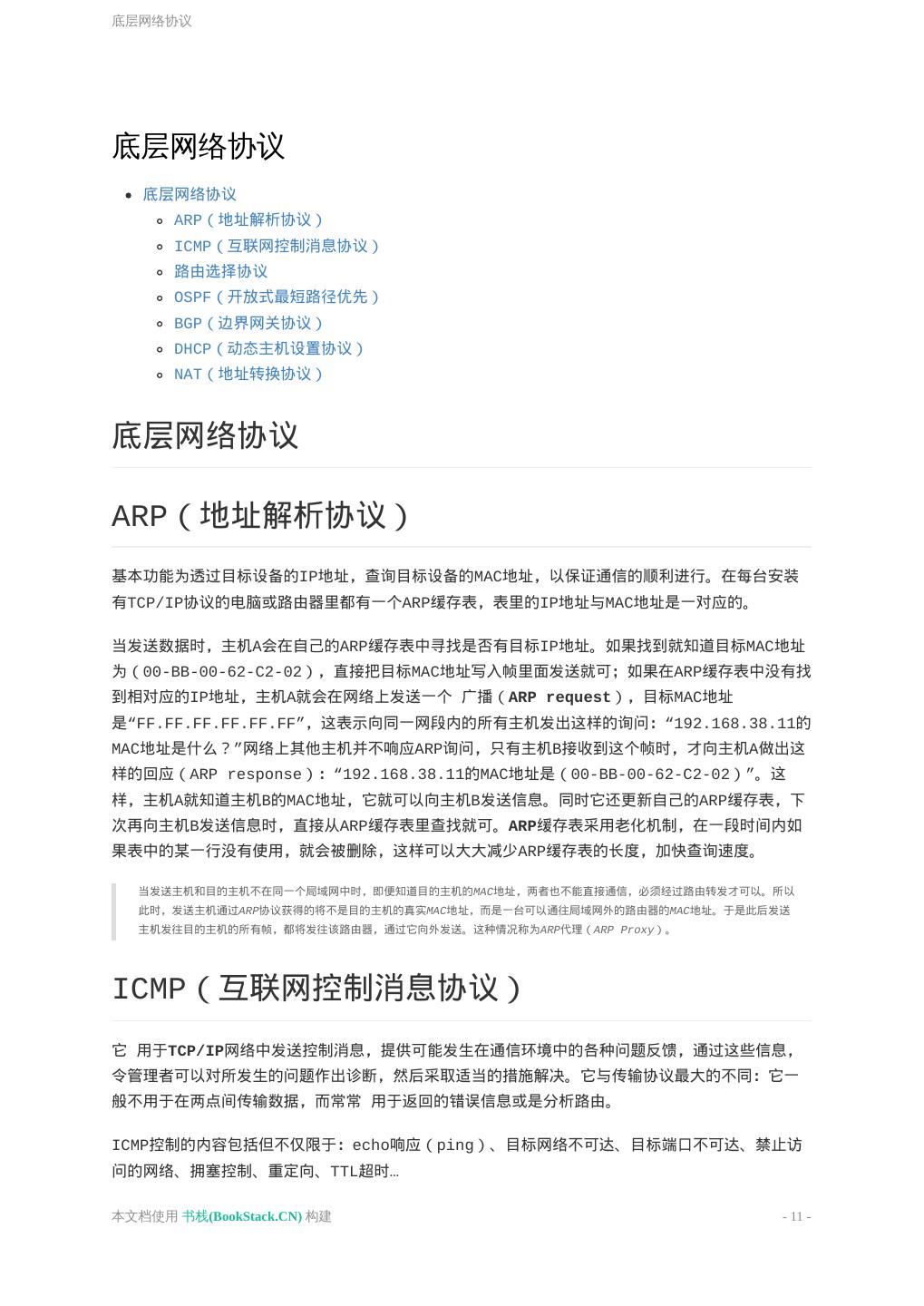 11 .底层网络协议 底层网络协议 底层网络协议 ARP(地址解析协议) ICMP(互联网控制消息协议) 路由选择协议 OSPF(开放式最短路径优先) BGP(边界网关协议) DHCP(动态主机设置协议) NAT(地址转换协议) 底层网络协议 ARP(地址解析协议) 基本功能为透过目标设备的IP地址,查询目标设备的MAC地址,以保证通信的顺利进行。在每台安装 有TCP/IP协议的电脑或路由器里都有一个ARP缓存表,表里的IP地址与MAC地址是一对应的。 当发送数据时,主机A会在自己的ARP缓存表中寻找是否有目标IP地址。如果找到就知道目标MAC地址 为(00-BB-00-62-C2-02),直接把目标MAC地址写入帧里面发送就可;如果在ARP缓存表中没有找 到相对应的IP地址,主机A就会在网络上发送一个 广播(ARP request),目标MAC地址 是“FF.FF.FF.FF.FF.FF”,这表示向同一网段内的所有主机发出这样的询问:“192.168.38.11的 MAC地址是什么?”网络上其他主机并不响应ARP询问,只有主机B接收到这个帧时,才向主机A做出这 样的回应(ARP response):“192.168.38.11的MAC地址是(00-BB-00-62-C2-02)”。这 样,主机A就知道主机B的MAC地址,它就可以向主机B发送信息。同时它还更新自己的ARP缓存表,下 次再向主机B发送信息时,直接从ARP缓存表里查找就可。ARP缓存表采用老化机制,在一段时间内如 果表中的某一行没有使用,就会被删除,这样可以大大减少ARP缓存表的长度,加快查询速度。 当发送主机和目的主机不在同一个局域网中时,即便知道目的主机的MAC地址,两者也不能直接通信,必须经过路由转发才可以。所以 此时,发送主机通过ARP协议获得的将不是目的主机的真实MAC地址,而是一台可以通往局域网外的路由器的MAC地址。于是此后发送 主机发往目的主机的所有帧,都将发往该路由器,通过它向外发送。这种情况称为ARP代理(ARP Proxy)。 ICMP(互联网控制消息协议) 它 用于TCP/IP网络中发送控制消息,提供可能发生在通信环境中的各种问题反馈,通过这些信息, 令管理者可以对所发生的问题作出诊断,然后采取适当的措施解决。它与传输协议最大的不同:它一 般不用于在两点间传输数据,而常常 用于返回的错误信息或是分析路由。 ICMP控制的内容包括但不仅限于:echo响应(ping)、目标网络不可达、目标端口不可达、禁止访 问的网络、拥塞控制、重定向、TTL超时… 本文档使用 书栈(BookStack.CN) 构建 - 11 -