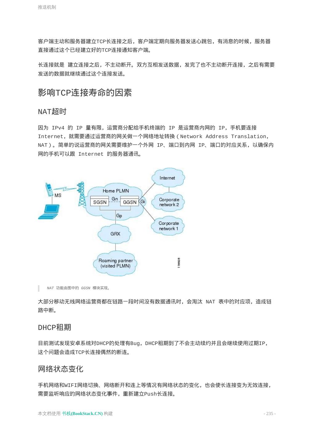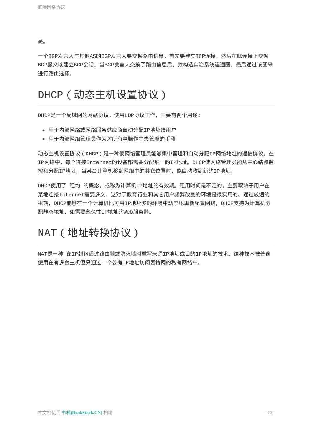 13 .底层网络协议 是。 一个BGP发言人与其他AS的BGP发言人要交换路由信息,首先要建立TCP连接,然后在此连接上交换 BGP报文以建立BGP会话。当BGP发言人交换了路由信息后,就构造自治系统连通图,最后通过该图来 进行路由选择。 DHCP(动态主机设置协议) DHCP是一个局域网的网络协议,使用UDP协议工作,主要有两个用途: 用于内部网络或网络服务供应商自动分配IP地址给用户 用于内部网络管理员作为对所有电脑作中央管理的手段 动态主机设置协议(DHCP)是一种使网络管理员能够集中管理和自动分配IP网络地址的通信协议。在 IP网络中,每个连接Internet的设备都需要分配唯一的IP地址。DHCP使网络管理员能从中心结点监 控和分配IP地址。当某台计算机移到网络中的其它位置时,能自动收到新的IP地址。 DHCP使用了 租约 的概念,或称为计算机IP地址的有效期。租用时间是不定的,主要取决于用户在 某地连接Internet需要多久,这对于教育行业和其它用户频繁改变的环境是很实用的。通过较短的 租期,DHCP能够在一个计算机比可用IP地址多的环境中动态地重新配置网络。DHCP支持为计算机分 配静态地址,如需要永久性IP地址的Web服务器。 NAT(地址转换协议) NAT是一种 在IP封包通过路由器或防火墙时重写来源IP地址或目的IP地址的技术。这种技术被普遍 使用在有多台主机但只通过一个公有IP地址访问因特网的私有网络中。 本文档使用 书栈(BookStack.CN) 构建 - 13 -