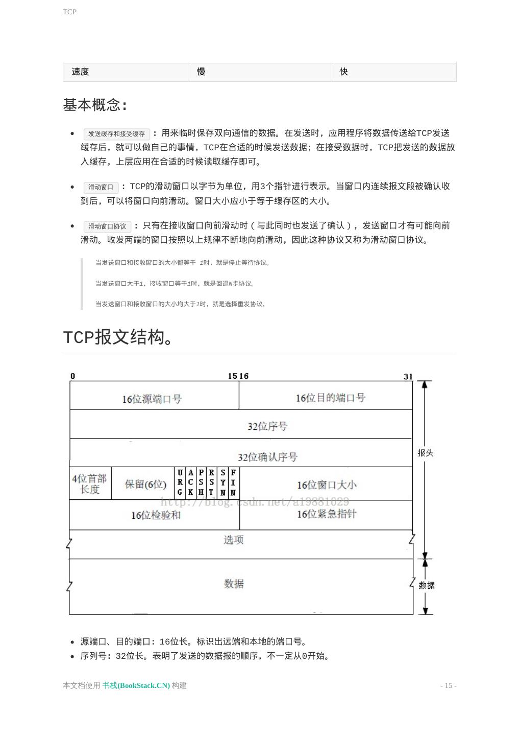 15 .TCP 速度 慢 快 基本概念: 发送缓存和接受缓存 :用来临时保存双向通信的数据。在发送时,应用程序将数据传送给TCP发送 缓存后,就可以做自己的事情,TCP在合适的时候发送数据;在接受数据时,TCP把发送的数据放 入缓存,上层应用在合适的时候读取缓存即可。 滑动窗口 :TCP的滑动窗口以字节为单位,用3个指针进行表示。当窗口内连续报文段被确认收 到后,可以将窗口向前滑动。窗口大小应小于等于缓存区的大小。 滑动窗口协议 :只有在接收窗口向前滑动时(与此同时也发送了确认),发送窗口才有可能向前 滑动。收发两端的窗口按照以上规律不断地向前滑动,因此这种协议又称为滑动窗口协议。 当发送窗口和接收窗口的大小都等于 1时,就是停止等待协议。 当发送窗口大于1,接收窗口等于1时,就是回退N步协议。 当发送窗口和接收窗口的大小均大于1时,就是选择重发协议。 TCP报文结构。 源端口、目的端口:16位长。标识出远端和本地的端口号。 序列号:32位长。表明了发送的数据报的顺序,不一定从0开始。 本文档使用 书栈(BookStack.CN) 构建 - 15 -