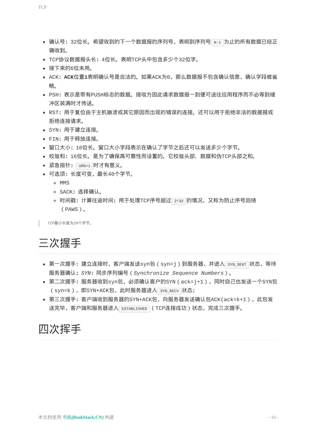 16 .TCP 确认号:32位长。希望收到的下一个数据报的序列号,表明到序列号 N-1 为止的所有数据已经正 确收到。 TCP协议数据报头长:4位长。表明TCP头中包含多少个32位字。 接下来的6位未用。 ACK:ACK位置1表明确认号是合法的。如果ACK为0,那么数据报不包含确认信息,确认字段被省 略。 PSH:表示是带有PUSH标志的数据。接收方因此请求数据报一到便可送往应用程序而不必等到缓 冲区装满时才传送。 RST:用于复位由于主机崩溃或其它原因而出现的错误的连接。还可以用于拒绝非法的数据报或 拒绝连接请求。 SYN:用于建立连接。 FIN:用于释放连接。 窗口大小:16位长。窗口大小字段表示在确认了字节之后还可以发送多少个字节。 校验和:16位长。是为了确保高可靠性而设置的。它校验头部、数据和伪TCP头部之和。 紧急指针: URG=1 时才有意义。 可选项:长度可变,最长40个字节。 MMS SACK:选择确认。 时间戳:计算往返时间;用于处理TCP序号超过 2^32 的情况,又称为防止序号回绕 (PAWS)。 TCP最小长度为20个字节。 三次握手 第一次握手:建立连接时,客户端发送syn包(syn=j)到服务器,并进入 SYN_SENT 状态,等待 服务器确认;SYN:同步序列编号(Synchronize Sequence Numbers)。 第二次握手:服务器收到syn包,必须确认客户的SYN(ack=j+1),同时自己也发送一个SYN包 (syn=k),即SYN+ACK包,此时服务器进入 SYN_RECV 状态; 第三次握手:客户端收到服务器的SYN+ACK包,向服务器发送确认包ACK(ack=k+1),此包发 送完毕,客户端和服务器进入 ESTABLISHED (TCP连接成功)状态,完成三次握手。 四次挥手 本文档使用 书栈(BookStack.CN) 构建 - 16 -