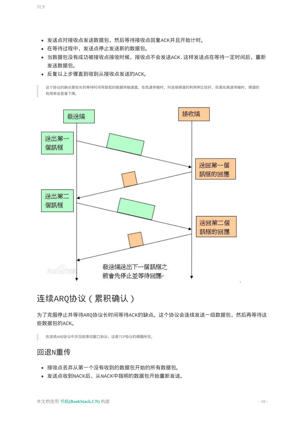 18 .TCP 发送点对接收点发送数据包,然后等待接收点回复ACK并且开始计时。 在等待过程中,发送点停止发送新的数据包。 当数据包没有成功被接收点接收时候,接收点不会发送ACK.这样发送点在等待一定时间后,重新 发送数据包。 反复以上步骤直到收到从接收点发送的ACK。 这个协议的缺点是较长的等待时间导致低的数据传输速度。在低速传输时,对连接频道的利用率比较好,但是在高速传输时,频道的 利用率会显著下降。 连续ARQ协议(累积确认) 为了克服停止并等待ARQ协议长时间等待ACK的缺点。这个协议会连续发送一组数据包,然后再等待这 些数据包的ACK。 在连续ARQ协议中涉及到滑动窗口协议,这是TCP协议的精髓所在。 回退N重传 接收点丢弃从第一个没有收到的数据包开始的所有数据包。 发送点收到NACK后,从NACK中指明的数据包开始重新发送。 本文档使用 书栈(BookStack.CN) 构建 - 18 -