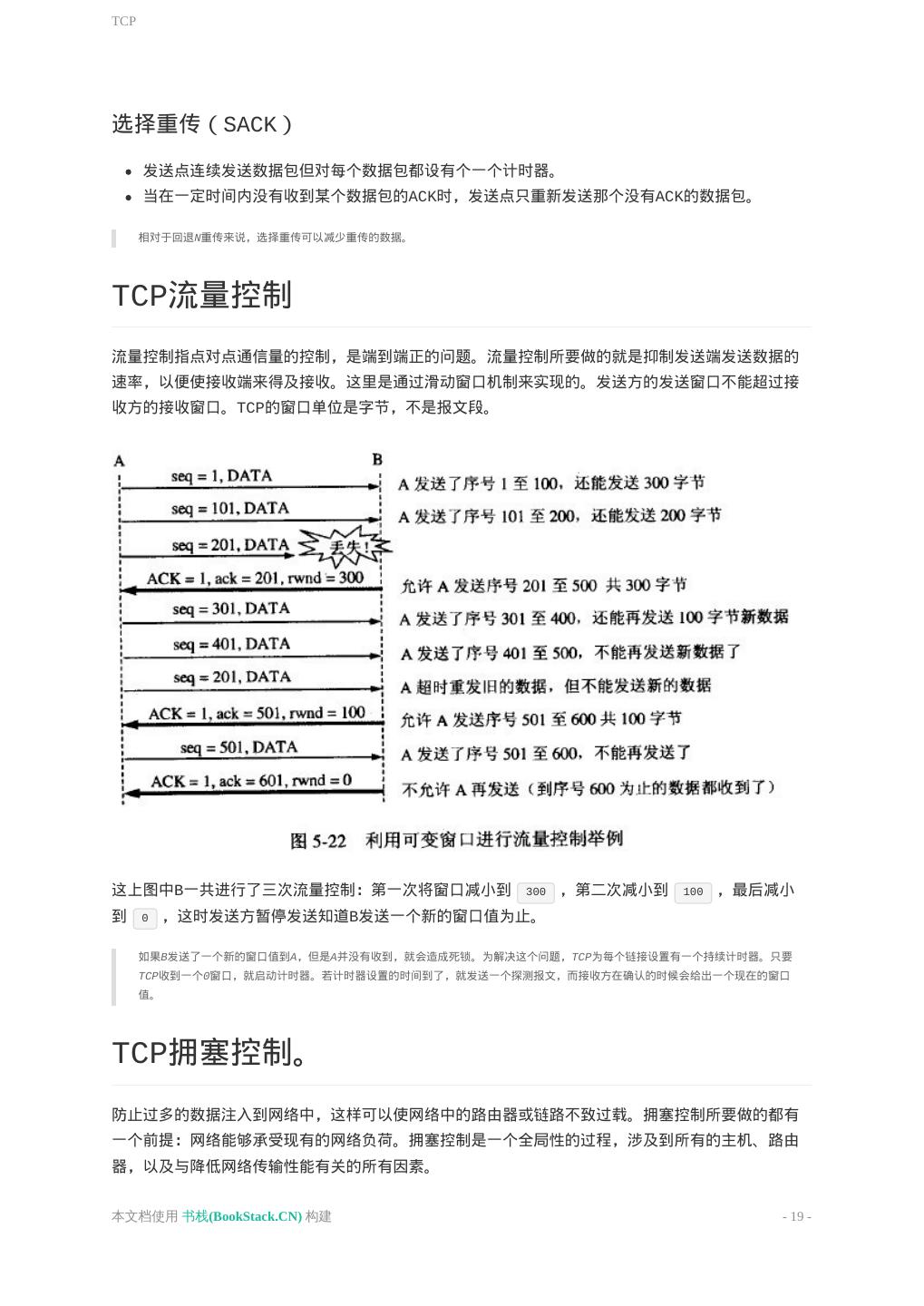 19 .TCP 选择重传(SACK) 发送点连续发送数据包但对每个数据包都设有个一个计时器。 当在一定时间内没有收到某个数据包的ACK时,发送点只重新发送那个没有ACK的数据包。 相对于回退N重传来说,选择重传可以减少重传的数据。 TCP流量控制 流量控制指点对点通信量的控制,是端到端正的问题。流量控制所要做的就是抑制发送端发送数据的 速率,以便使接收端来得及接收。这里是通过滑动窗口机制来实现的。发送方的发送窗口不能超过接 收方的接收窗口。TCP的窗口单位是字节,不是报文段。 这上图中B一共进行了三次流量控制:第一次将窗口减小到 300 ,第二次减小到 100 ,最后减小 到 0 ,这时发送方暂停发送知道B发送一个新的窗口值为止。 如果B发送了一个新的窗口值到A,但是A并没有收到,就会造成死锁。为解决这个问题,TCP为每个链接设置有一个持续计时器。只要 TCP收到一个0窗口,就启动计时器。若计时器设置的时间到了,就发送一个探测报文,而接收方在确认的时候会给出一个现在的窗口 值。 TCP拥塞控制。 防止过多的数据注入到网络中,这样可以使网络中的路由器或链路不致过载。拥塞控制所要做的都有 一个前提:网络能够承受现有的网络负荷。拥塞控制是一个全局性的过程,涉及到所有的主机、路由 器,以及与降低网络传输性能有关的所有因素。 本文档使用 书栈(BookStack.CN) 构建 - 19 -