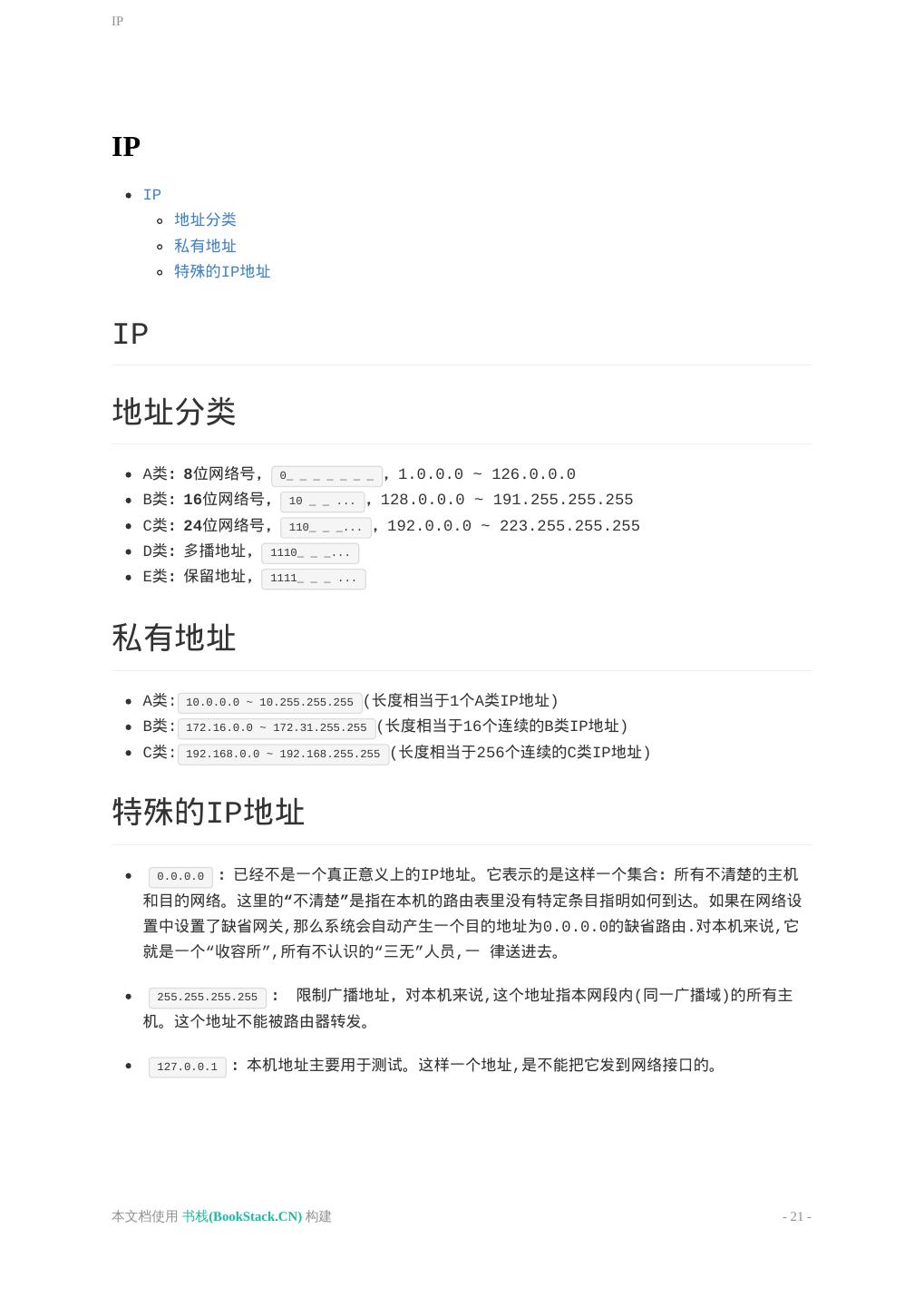 21 .IP IP IP 地址分类 私有地址 特殊的IP地址 IP 地址分类 A类:8位网络号, 0_ _ _ _ _ _ _ ,1.0.0.0 ~ 126.0.0.0 B类:16位网络号, 10 _ _ ... ,128.0.0.0 ~ 191.255.255.255 C类:24位网络号, 110_ _ _... ,192.0.0.0 ~ 223.255.255.255 D类:多播地址, 1110_ _ _... E类:保留地址, 1111_ _ _ ... 私有地址 A类: 10.0.0.0 ~ 10.255.255.255 (长度相当于1个A类IP地址) B类: 172.16.0.0 ~ 172.31.255.255 (长度相当于16个连续的B类IP地址) C类: 192.168.0.0 ~ 192.168.255.255 (长度相当于256个连续的C类IP地址) 特殊的IP地址 0.0.0.0 :已经不是一个真正意义上的IP地址。它表示的是这样一个集合:所有不清楚的主机 和目的网络。这里的“不清楚”是指在本机的路由表里没有特定条目指明如何到达。如果在网络设 置中设置了缺省网关,那么系统会自动产生一个目的地址为0.0.0.0的缺省路由.对本机来说,它 就是一个“收容所”,所有不认识的“三无”人员,一 律送进去。 255.255.255.255 : 限制广播地址,对本机来说,这个地址指本网段内(同一广播域)的所有主 机。这个地址不能被路由器转发。 127.0.0.1 :本机地址主要用于测试。这样一个地址,是不能把它发到网络接口的。 本文档使用 书栈(BookStack.CN) 构建 - 21 -