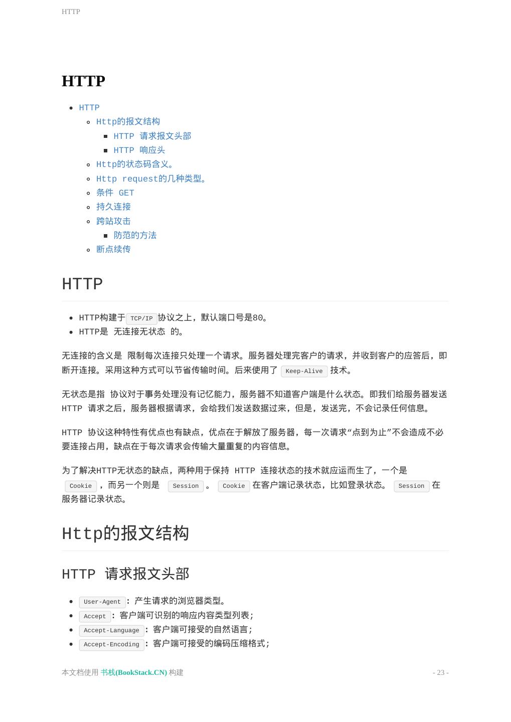 23 .HTTP HTTP HTTP Http的报文结构 HTTP 请求报文头部 HTTP 响应头 Http的状态码含义。 Http request的几种类型。 条件 GET 持久连接 跨站攻击 防范的方法 断点续传 HTTP HTTP构建于 TCP/IP 协议之上,默认端口号是80。 HTTP是 无连接无状态 的。 无连接的含义是 限制每次连接只处理一个请求。服务器处理完客户的请求,并收到客户的应答后,即 断开连接。采用这种方式可以节省传输时间。后来使用了 Keep-Alive 技术。 无状态是指 协议对于事务处理没有记忆能力,服务器不知道客户端是什么状态。即我们给服务器发送 HTTP 请求之后,服务器根据请求,会给我们发送数据过来,但是,发送完,不会记录任何信息。 HTTP 协议这种特性有优点也有缺点,优点在于解放了服务器,每一次请求“点到为止”不会造成不必 要连接占用,缺点在于每次请求会传输大量重复的内容信息。 为了解决HTTP无状态的缺点,两种用于保持 HTTP 连接状态的技术就应运而生了,一个是 Cookie ,而另一个则是 Session 。 Cookie 在客户端记录状态,比如登录状态。 Session 在 服务器记录状态。 Http的报文结构 HTTP 请求报文头部 User-Agent :产生请求的浏览器类型。 Accept :客户端可识别的响应内容类型列表; Accept-Language :客户端可接受的自然语言; Accept-Encoding :客户端可接受的编码压缩格式; 本文档使用 书栈(BookStack.CN) 构建 - 23 -