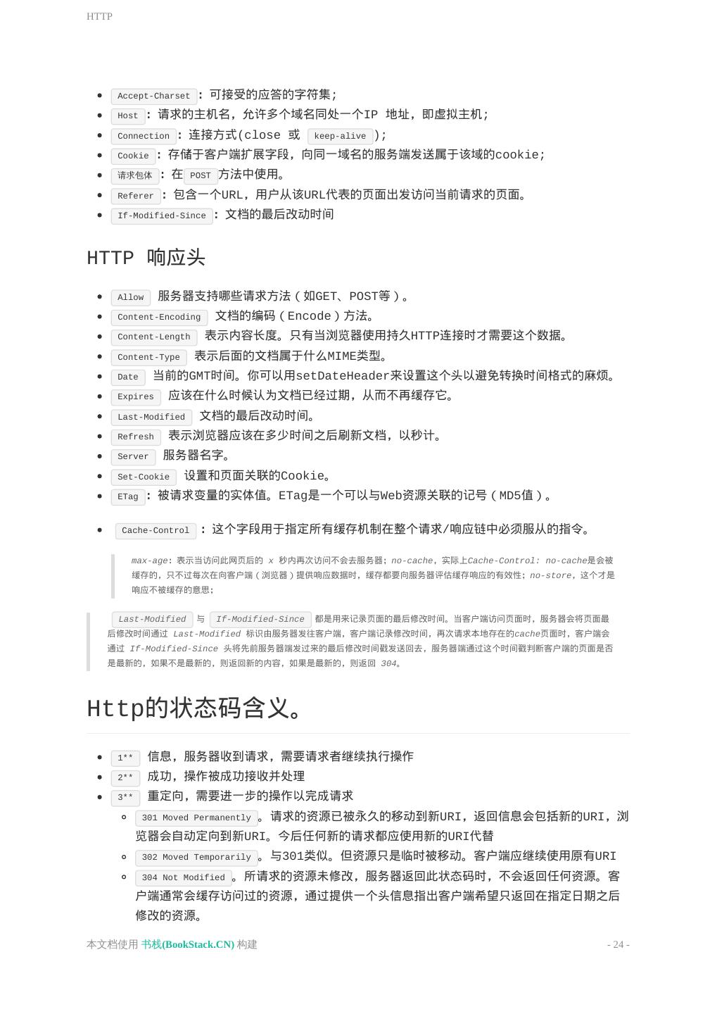 24 .HTTP Accept-Charset :可接受的应答的字符集; Host :请求的主机名,允许多个域名同处一个IP 地址,即虚拟主机; Connection :连接方式(close 或 keep-alive ); Cookie :存储于客户端扩展字段,向同一域名的服务端发送属于该域的cookie; 请求包体 :在 POST 方法中使用。 Referer :包含一个URL,用户从该URL代表的页面出发访问当前请求的页面。 If-Modified-Since :文档的最后改动时间 HTTP 响应头 Allow 服务器支持哪些请求方法(如GET、POST等)。 Content-Encoding 文档的编码(Encode)方法。 Content-Length 表示内容长度。只有当浏览器使用持久HTTP连接时才需要这个数据。 Content-Type 表示后面的文档属于什么MIME类型。 Date 当前的GMT时间。你可以用setDateHeader来设置这个头以避免转换时间格式的麻烦。 Expires 应该在什么时候认为文档已经过期,从而不再缓存它。 Last-Modified 文档的最后改动时间。 Refresh 表示浏览器应该在多少时间之后刷新文档,以秒计。 Server 服务器名字。 Set-Cookie 设置和页面关联的Cookie。 ETag :被请求变量的实体值。ETag是一个可以与Web资源关联的记号(MD5值)。 Cache-Control :这个字段用于指定所有缓存机制在整个请求/响应链中必须服从的指令。 max-age:表示当访问此网页后的 x 秒内再次访问不会去服务器;no-cache,实际上Cache-Control: no-cache是会被 缓存的,只不过每次在向客户端(浏览器)提供响应数据时,缓存都要向服务器评估缓存响应的有效性;no-store,这个才是 响应不被缓存的意思; Last-Modified 与 If-Modified-Since 都是用来记录页面的最后修改时间。当客户端访问页面时,服务器会将页面最 后修改时间通过 Last-Modified 标识由服务器发往客户端,客户端记录修改时间,再次请求本地存在的cache页面时,客户端会 通过 If-Modified-Since 头将先前服务器端发过来的最后修改时间戳发送回去,服务器端通过这个时间戳判断客户端的页面是否 是最新的,如果不是最新的,则返回新的内容,如果是最新的,则返回 304。 Http的状态码含义。 1** 信息,服务器收到请求,需要请求者继续执行操作 2** 成功,操作被成功接收并处理 3** 重定向,需要进一步的操作以完成请求 301 Moved Permanently 。请求的资源已被永久的移动到新URI,返回信息会包括新的URI,浏 览器会自动定向到新URI。今后任何新的请求都应使用新的URI代替 302 Moved Temporarily 。与301类似。但资源只是临时被移动。客户端应继续使用原有URI 304 Not Modified 。所请求的资源未修改,服务器返回此状态码时,不会返回任何资源。客 户端通常会缓存访问过的资源,通过提供一个头信息指出客户端希望只返回在指定日期之后 修改的资源。 本文档使用 书栈(BookStack.CN) 构建 - 24 -
