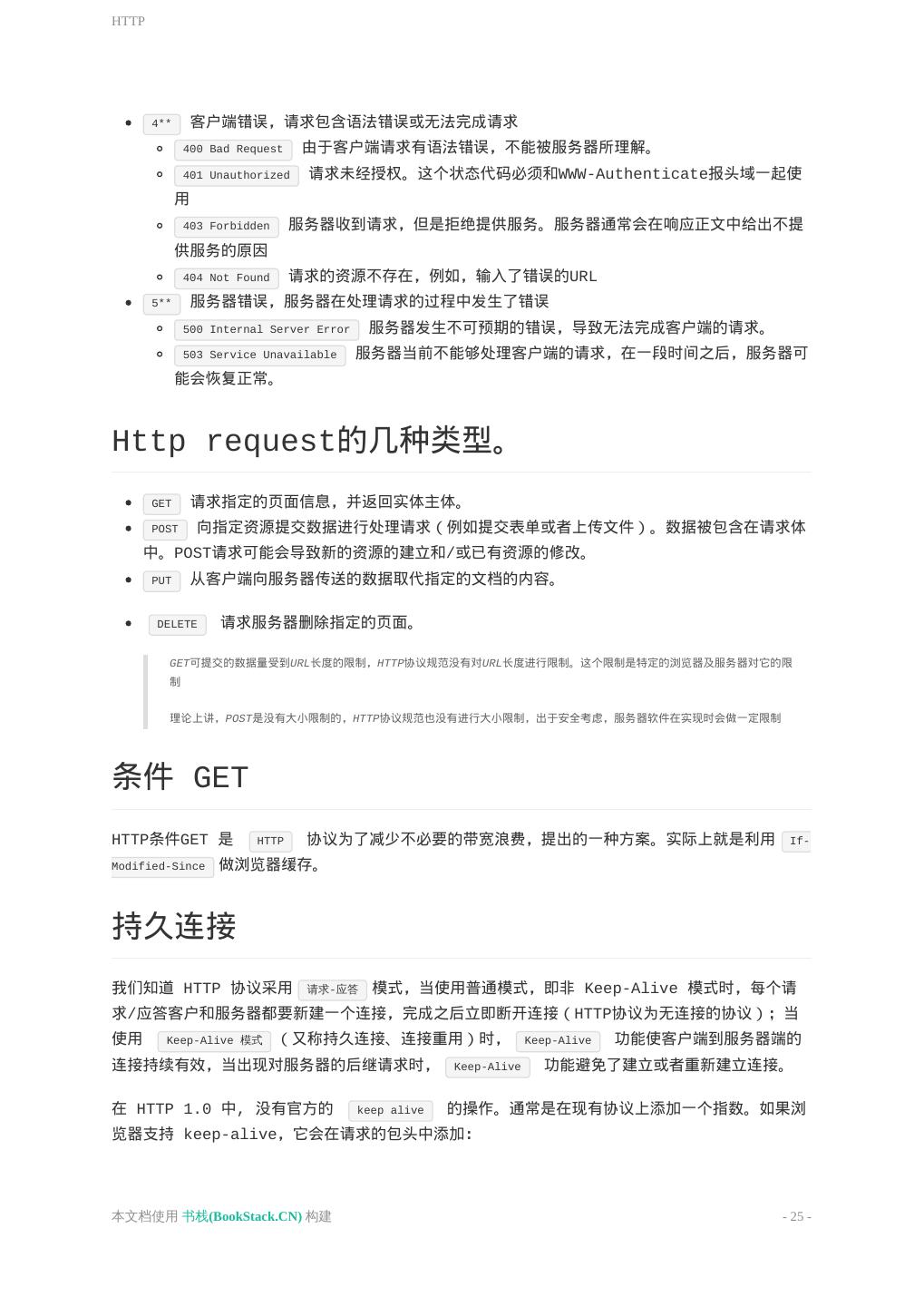 25 .HTTP 4** 客户端错误,请求包含语法错误或无法完成请求 400 Bad Request 由于客户端请求有语法错误,不能被服务器所理解。 401 Unauthorized 请求未经授权。这个状态代码必须和WWW-Authenticate报头域一起使 用 403 Forbidden 服务器收到请求,但是拒绝提供服务。服务器通常会在响应正文中给出不提 供服务的原因 404 Not Found 请求的资源不存在,例如,输入了错误的URL 5** 服务器错误,服务器在处理请求的过程中发生了错误 500 Internal Server Error 服务器发生不可预期的错误,导致无法完成客户端的请求。 503 Service Unavailable 服务器当前不能够处理客户端的请求,在一段时间之后,服务器可 能会恢复正常。 Http request的几种类型。 GET 请求指定的页面信息,并返回实体主体。 POST 向指定资源提交数据进行处理请求(例如提交表单或者上传文件)。数据被包含在请求体 中。POST请求可能会导致新的资源的建立和/或已有资源的修改。 PUT 从客户端向服务器传送的数据取代指定的文档的内容。 DELETE 请求服务器删除指定的页面。 GET可提交的数据量受到URL长度的限制,HTTP协议规范没有对URL长度进行限制。这个限制是特定的浏览器及服务器对它的限 制 理论上讲,POST是没有大小限制的,HTTP协议规范也没有进行大小限制,出于安全考虑,服务器软件在实现时会做一定限制 条件 GET HTTP条件GET 是 HTTP 协议为了减少不必要的带宽浪费,提出的一种方案。实际上就是利用 If- Modified-Since 做浏览器缓存。 持久连接 我们知道 HTTP 协议采用 请求-应答 模式,当使用普通模式,即非 Keep-Alive 模式时,每个请 求/应答客户和服务器都要新建一个连接,完成之后立即断开连接(HTTP协议为无连接的协议);当 使用 Keep-Alive 模式 (又称持久连接、连接重用)时, Keep-Alive 功能使客户端到服务器端的 连接持续有效,当出现对服务器的后继请求时, Keep-Alive 功能避免了建立或者重新建立连接。 在 HTTP 1.0 中, 没有官方的 keep alive 的操作。通常是在现有协议上添加一个指数。如果浏 览器支持 keep-alive,它会在请求的包头中添加: 本文档使用 书栈(BookStack.CN) 构建 - 25 -