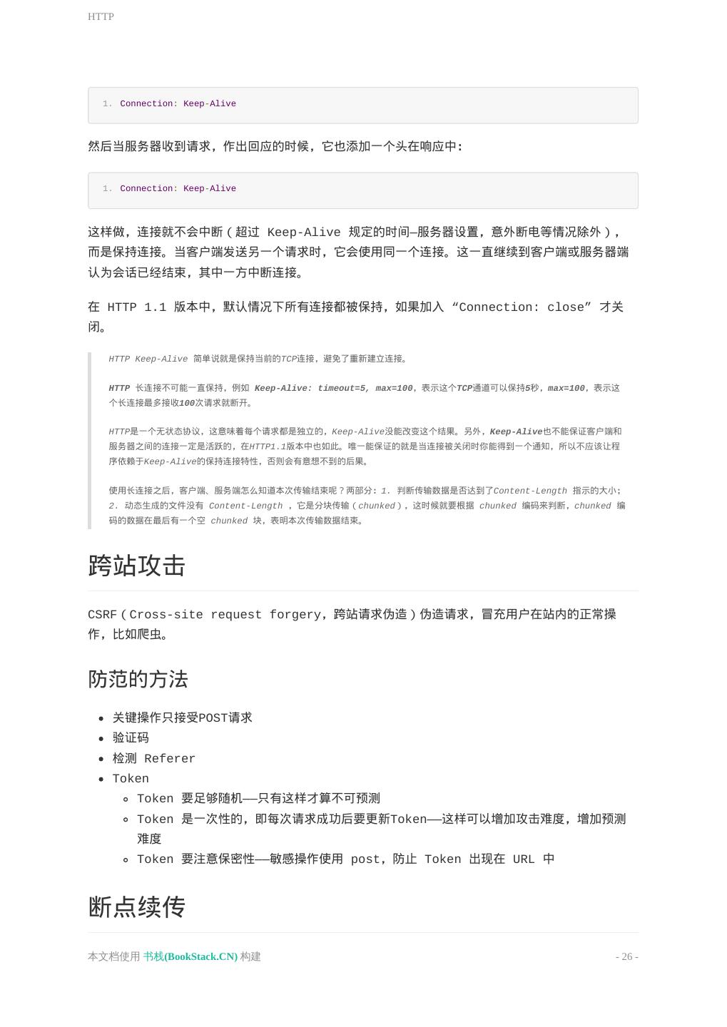 26 .HTTP 1. Connection: Keep-Alive 然后当服务器收到请求,作出回应的时候,它也添加一个头在响应中: 1. Connection: Keep-Alive 这样做,连接就不会中断(超过 Keep-Alive 规定的时间—服务器设置,意外断电等情况除外), 而是保持连接。当客户端发送另一个请求时,它会使用同一个连接。这一直继续到客户端或服务器端 认为会话已经结束,其中一方中断连接。 在 HTTP 1.1 版本中,默认情况下所有连接都被保持,如果加入 “Connection: close” 才关 闭。 HTTP Keep-Alive 简单说就是保持当前的TCP连接,避免了重新建立连接。 HTTP 长连接不可能一直保持,例如 Keep-Alive: timeout=5, max=100,表示这个TCP通道可以保持5秒,max=100,表示这 个长连接最多接收100次请求就断开。 HTTP是一个无状态协议,这意味着每个请求都是独立的,Keep-Alive没能改变这个结果。另外,Keep-Alive也不能保证客户端和 服务器之间的连接一定是活跃的,在HTTP1.1版本中也如此。唯一能保证的就是当连接被关闭时你能得到一个通知,所以不应该让程 序依赖于Keep-Alive的保持连接特性,否则会有意想不到的后果。 使用长连接之后,客户端、服务端怎么知道本次传输结束呢?两部分:1. 判断传输数据是否达到了Content-Length 指示的大小; 2. 动态生成的文件没有 Content-Length ,它是分块传输(chunked),这时候就要根据 chunked 编码来判断,chunked 编 码的数据在最后有一个空 chunked 块,表明本次传输数据结束。 跨站攻击 CSRF(Cross-site request forgery,跨站请求伪造)伪造请求,冒充用户在站内的正常操 作,比如爬虫。 防范的方法 关键操作只接受POST请求 验证码 检测 Referer Token Token 要足够随机——只有这样才算不可预测 Token 是一次性的,即每次请求成功后要更新Token——这样可以增加攻击难度,增加预测 难度 Token 要注意保密性——敏感操作使用 post,防止 Token 出现在 URL 中 断点续传 本文档使用 书栈(BookStack.CN) 构建 - 26 -