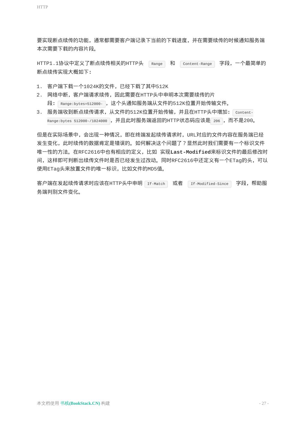 27 .HTTP 要实现断点续传的功能,通常都需要客户端记录下当前的下载进度,并在需要续传的时候通知服务端 本次需要下载的内容片段。 HTTP1.1协议中定义了断点续传相关的HTTP头 Range 和 Content-Range 字段,一个最简单的 断点续传实现大概如下: 1. 客户端下载一个1024K的文件,已经下载了其中512K 2. 网络中断,客户端请求续传,因此需要在HTTP头中申明本次需要续传的片 段: Range:bytes=512000- ,这个头通知服务端从文件的512K位置开始传输文件。 3. 服务端收到断点续传请求,从文件的512K位置开始传输,并且在HTTP头中增加: Content- Range:bytes 512000-/1024000 ,并且此时服务端返回的HTTP状态码应该是 206 ,而不是200。 但是在实际场景中,会出现一种情况,即在终端发起续传请求时,URL对应的文件内容在服务端已经 发生变化,此时续传的数据肯定是错误的。如何解决这个问题了?显然此时我们需要有一个标识文件 唯一性的方法。在RFC2616中也有相应的定义,比如 实现Last-Modified来标识文件的最后修改时 间,这样即可判断出续传文件时是否已经发生过改动。同时RFC2616中还定义有一个ETag的头,可以 使用ETag头来放置文件的唯一标识,比如文件的MD5值。 客户端在发起续传请求时应该在HTTP头中申明 If-Match 或者 If-Modified-Since 字段,帮助服 务端判别文件变化。 本文档使用 书栈(BookStack.CN) 构建 - 27 -