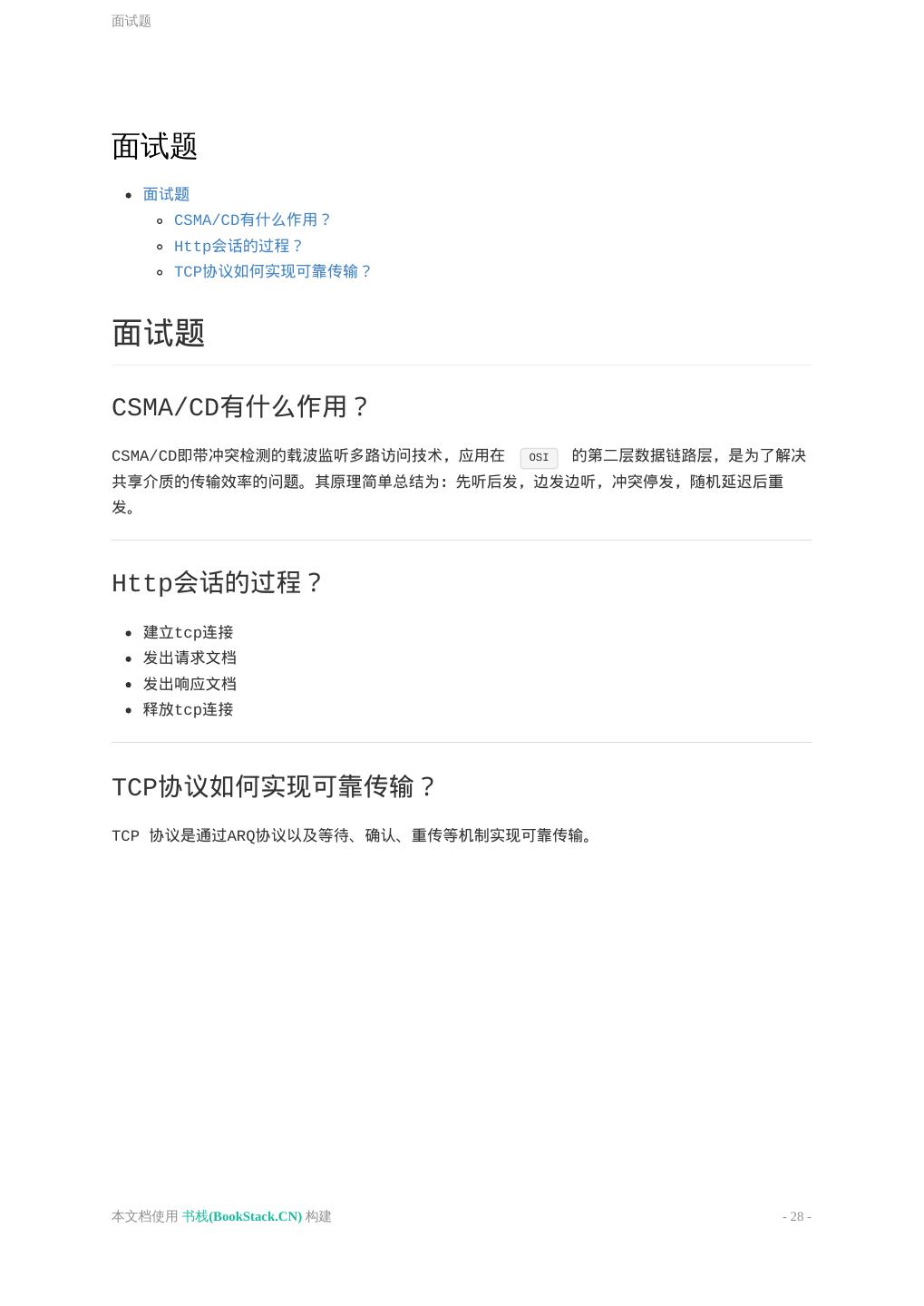 28 .面试题 面试题 面试题 CSMA/CD有什么作用? Http会话的过程? TCP协议如何实现可靠传输? 面试题 CSMA/CD有什么作用? CSMA/CD即带冲突检测的载波监听多路访问技术,应用在 OSI 的第二层数据链路层,是为了解决 共享介质的传输效率的问题。其原理简单总结为:先听后发,边发边听,冲突停发,随机延迟后重 发。 Http会话的过程? 建立tcp连接 发出请求文档 发出响应文档 释放tcp连接 TCP协议如何实现可靠传输? TCP 协议是通过ARQ协议以及等待、确认、重传等机制实现可靠传输。 本文档使用 书栈(BookStack.CN) 构建 - 28 -