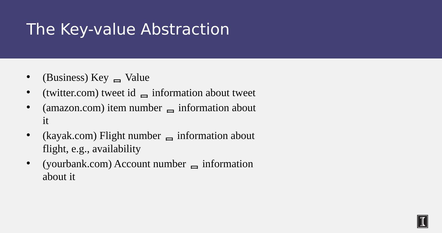 2 .The Key-value Abstraction (Business) Key Value ( twitter.com ) tweet id information about tweet ( amazon.com ) item number information about it ( kayak.com ) Flight number information about flight, e.g., availability ( yourbank.com ) Account number information about it