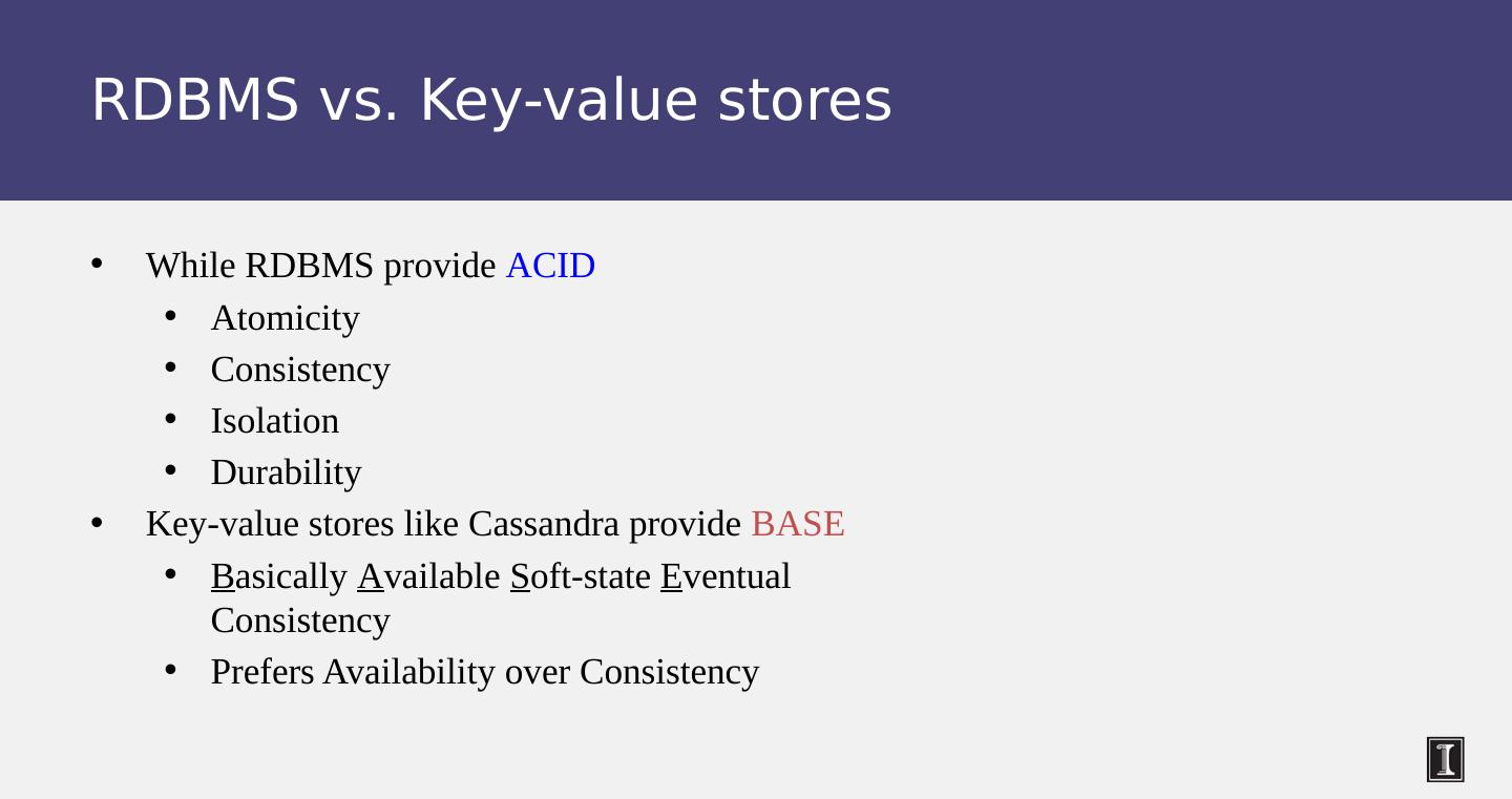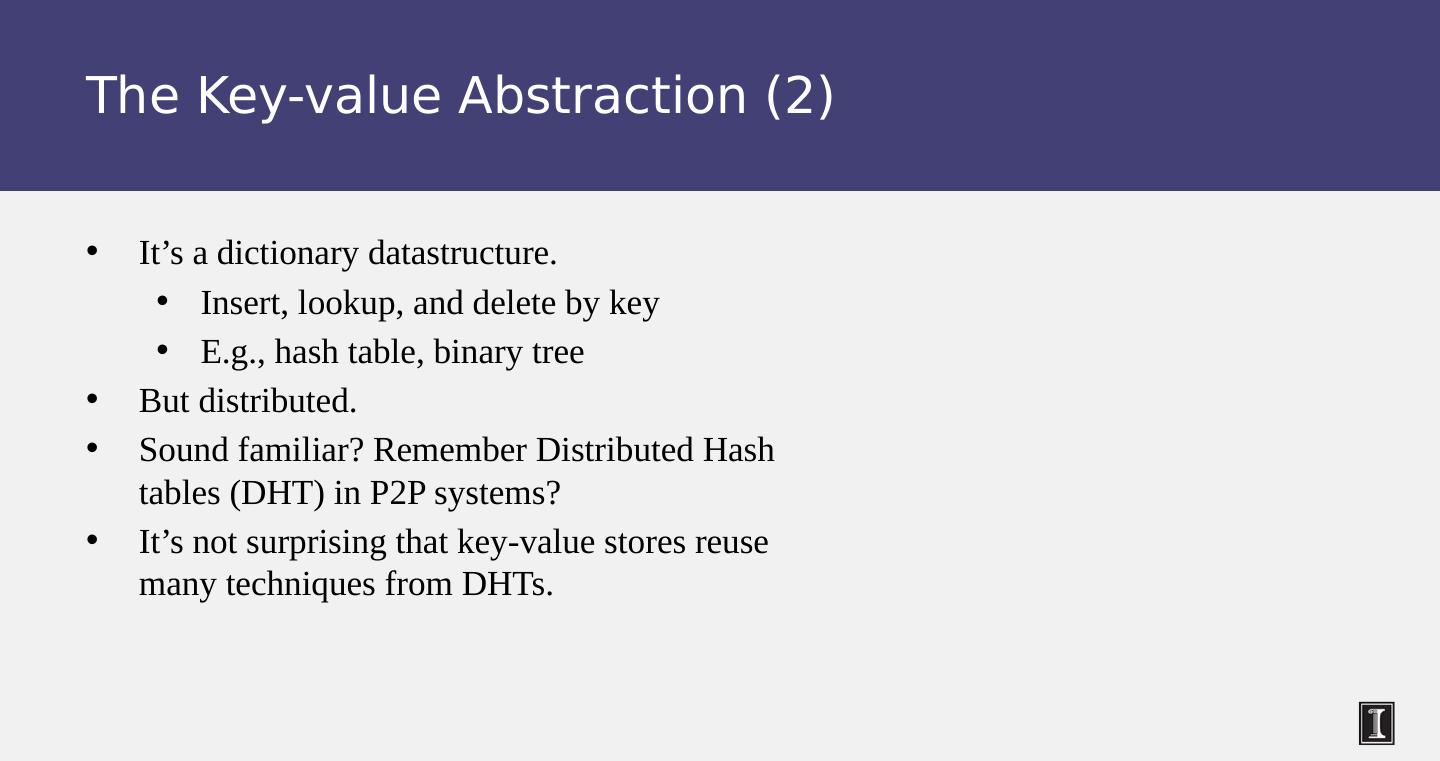3 .The Key-value Abstraction (2) It’s a dictionary datastructure . Insert, lookup, and delete by key E.g., hash table, binary tree But distributed. Sound familiar? Remember Distributed Hash tables (DHT) in P2P systems? It’s not surprising that key-value stores reuse many techniques from DHTs.