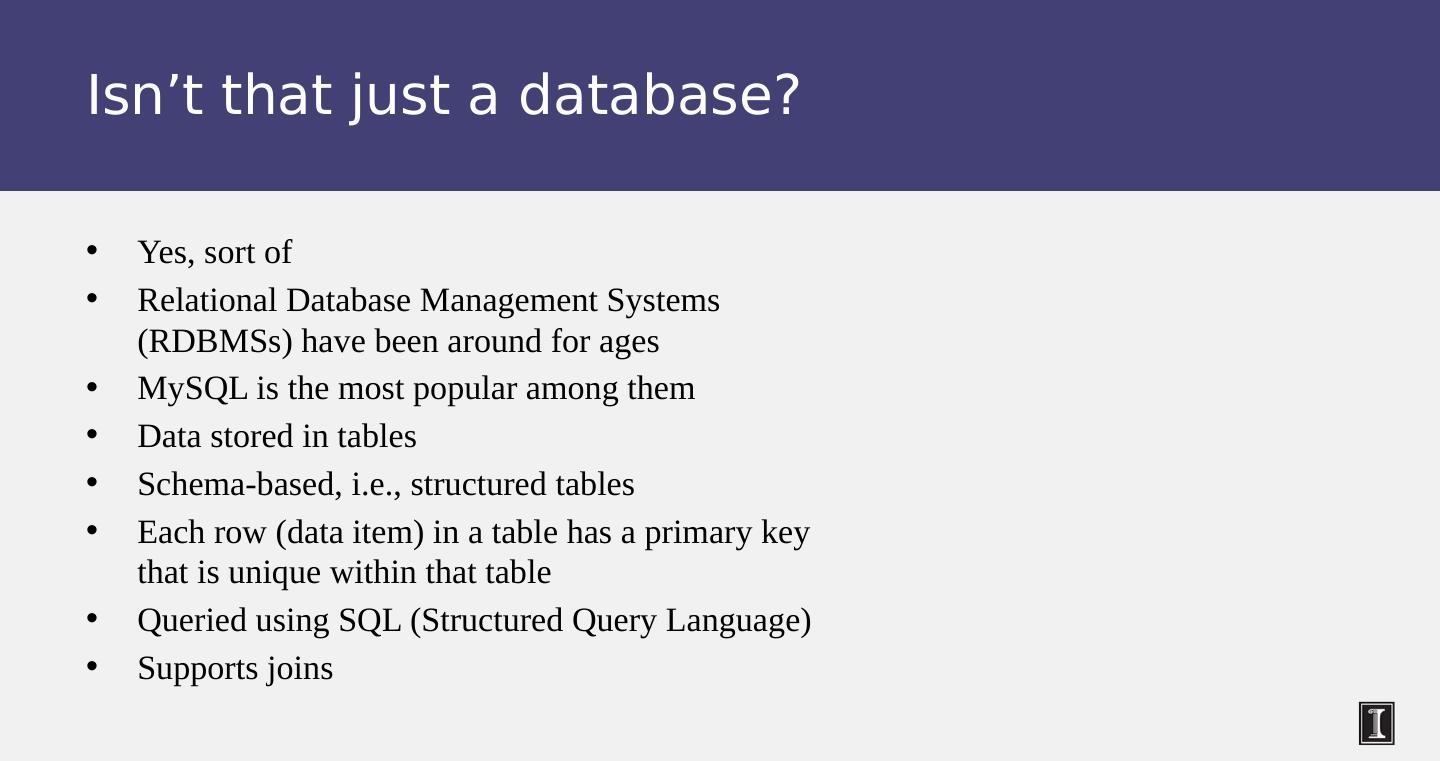 4 .Isn’t that just a database? Yes, sort of Relational Database Management Systems (RDBMSs) have been around for ages MySQL is the most popular among them Data stored in tables Schema-based, i.e., structured tables Each row (data item) in a table has a primary key that is unique within that table Queried using SQL (Structured Query Language) Supports joins