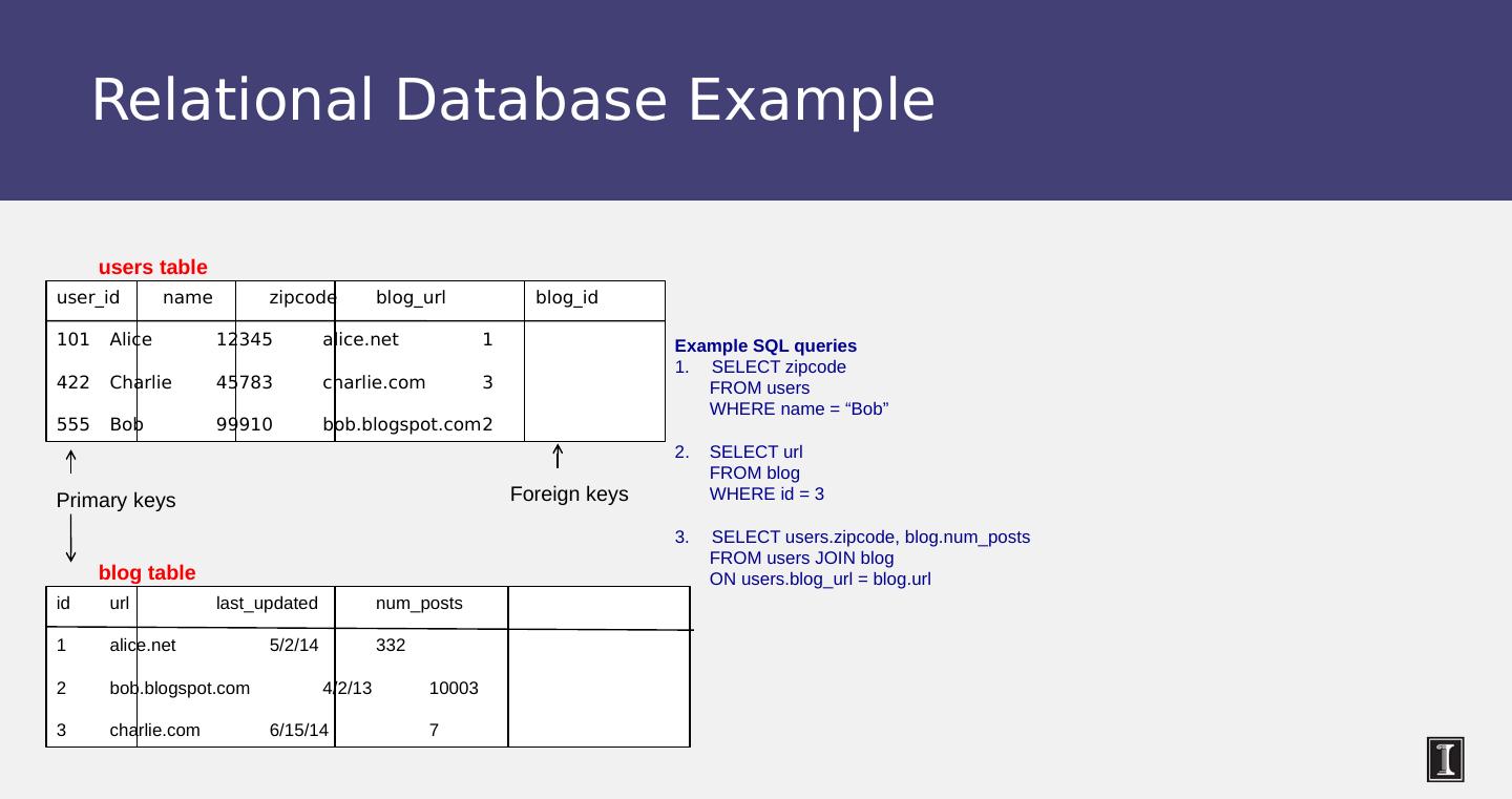 5 .Relational Database Example Example SQL queries SELECT zipcode FROM users WHERE name = “ Bob ” 2. SELECT url FROM blog WHERE id = 3 SELECT users.zipcode , blog.num_posts FROM users JOIN blog ON users.blog_url = blog.url user_id name zipcode blog_url blog_id 101 Alice 12345 alice.net 1 422 Charlie 45783 charlie.com 3 555 Bob 99910 bob.blogspot.com 2 users table Primary keys id url last_updated num_posts 1 alice.net 5/2/14 332 2 bob.blogspot.com 4/2/13 10003 3 charlie.com 6/15/14 7 blog table Foreign keys