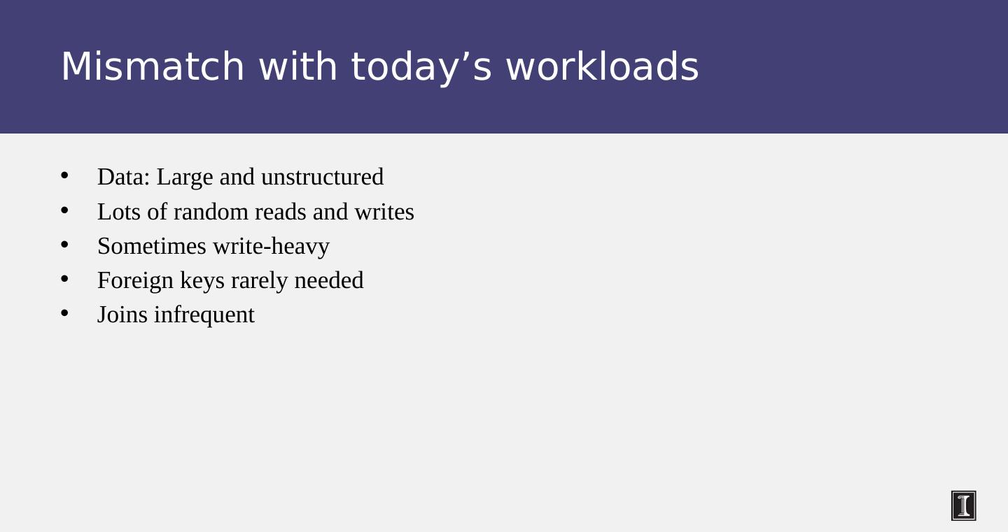 6 .Mismatch with today’s workloads Data: Large and unstructured Lots of random reads and writes Sometimes write-heavy Foreign keys rarely needed Joins infrequent
