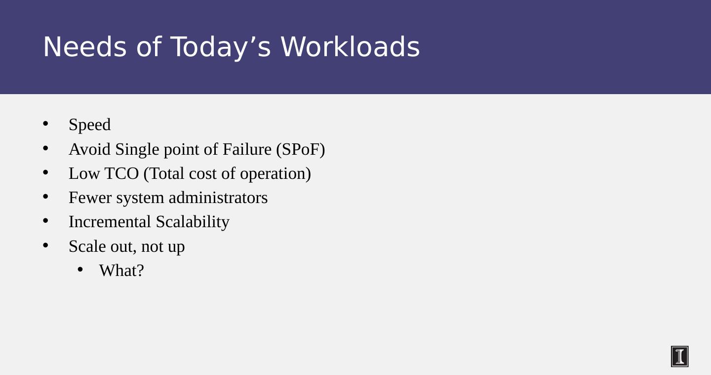 7 .Needs of Today’s Workloads Speed Avoid Single point of Failure ( SPoF ) Low TCO (Total cost of operation) Fewer system administrators Incremental Scalability Scale out, not up What?