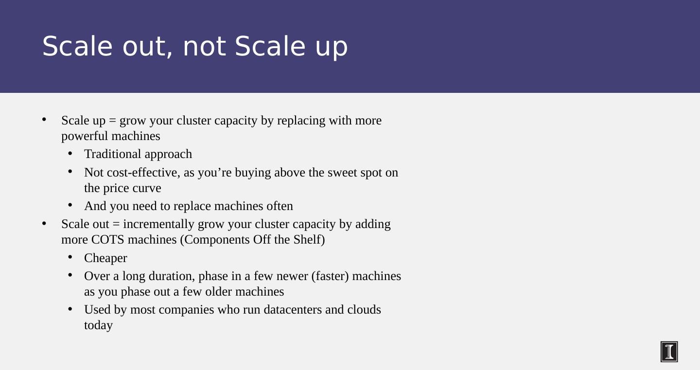 8 .Scale out, not Scale up Scale up = grow your cluster capacity by replacing with more powerful machines Traditional approach Not cost-effective, as you’re buying above the sweet spot on the price curve And you need to replace machines often Scale out = incrementally grow your cluster capacity by adding more COTS machines (Components Off the Shelf) Cheaper Over a long duration, phase in a few newer (faster) machines as you phase out a few older machines Used by most companies who run datacenters and clouds today
