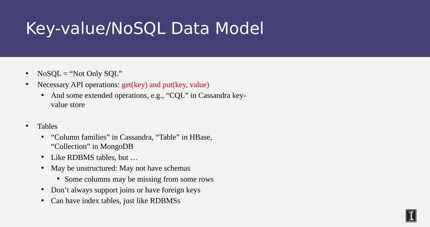 9 .Key-value/NoSQL Data Model NoSQL = “Not Only SQL” Necessary API operations: get(key) and put(key, value) And some extended operations, e.g., “CQL” in Cassandra key-value store Tables “Column families” in Cassandra, “ Table ” in HBase , “ Collection ” in MongoDB Like RDBMS tables, but … May be unstructured: May not have schemas Some columns may be missing from some rows Don’t always support joins or have foreign keys Can have index tables, just like RDBMSs