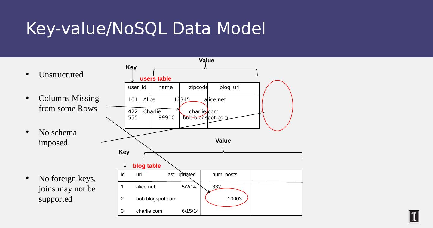 10 .Key-value/ NoSQL Data Model Unstructured Columns Missing from some Rows No schema imposed No foreign keys, joins may not be supported user_id name zipcode blog_url 101 Alice 12345 alice.net 422 Charlie charlie.com 555 99910 bob.blogspot.com users table id url last_updated num_posts 1 alice.net 5/2/14 332 2 bob.blogspot.com 10003 3 charlie.com 6/15/14 blog table Key Value Key Value