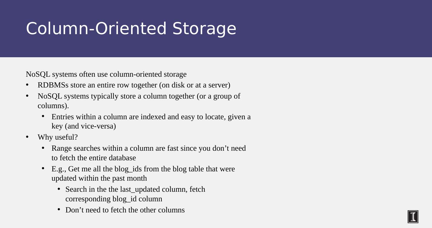 11 .Column-Oriented Storage NoSQL systems often use column-oriented storage RDBMSs store an entire row together (on disk or at a server) NoSQL systems typically store a column together (or a group of columns ). Entries within a column are indexed and easy to locate, given a key (and vice-versa) Why useful? Range searches within a column are fast since you don’t need to fetch the entire database E.g., Get me all the blog_ids from the blog table that were updated within the past month Search in the the last_updated column, fetch corresponding blog_id column Don’t need to fetch the other columns