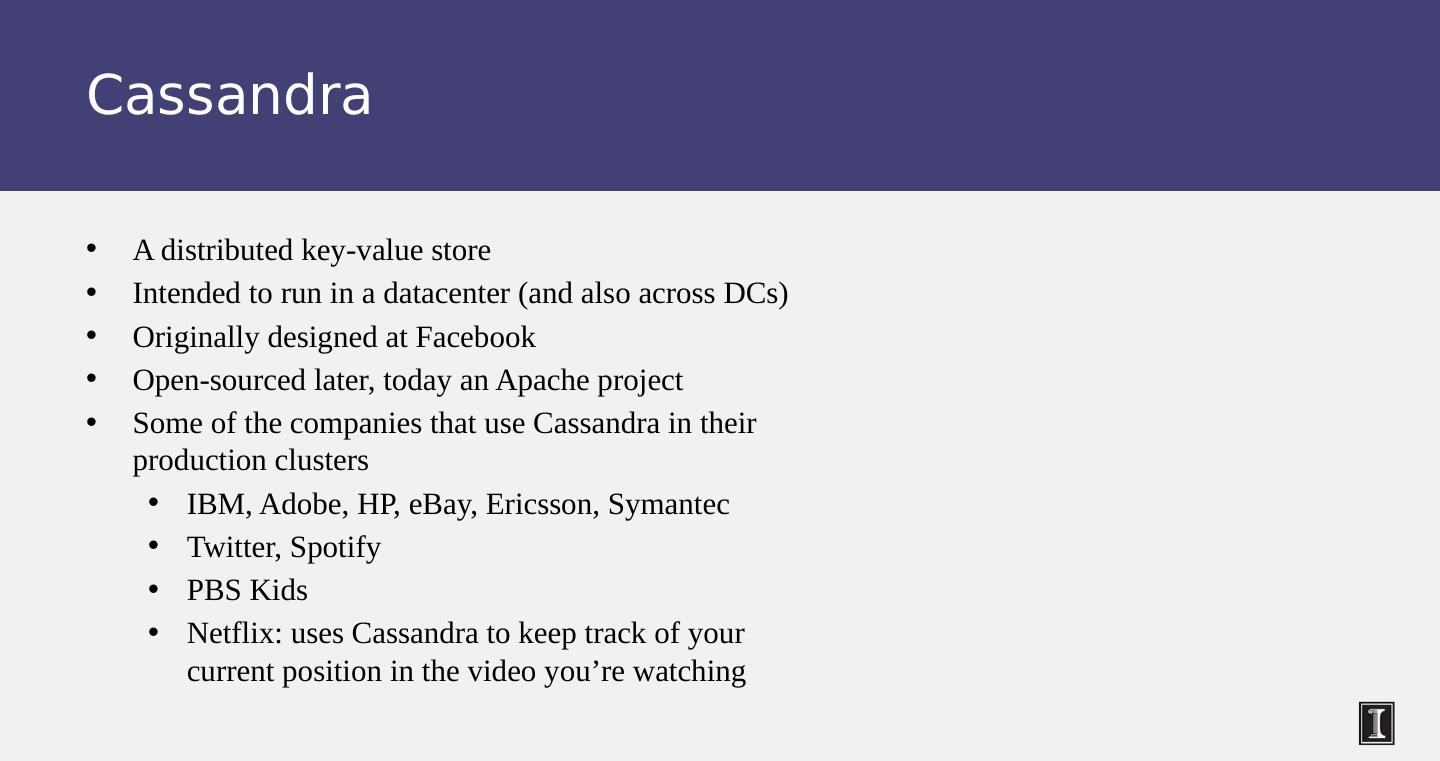 13 .Cassandra A distributed key-value store Intended to run in a datacenter (and also across DCs) Originally designed at Facebook Open-sourced later, today an Apache project Some of the companies that use Cassandra in their production clusters IBM, Adobe, HP, eBay, Ericsson, Symantec Twitter, Spotify PBS Kids Netflix: uses Cassandra to keep track of your current position in the video you’re watching