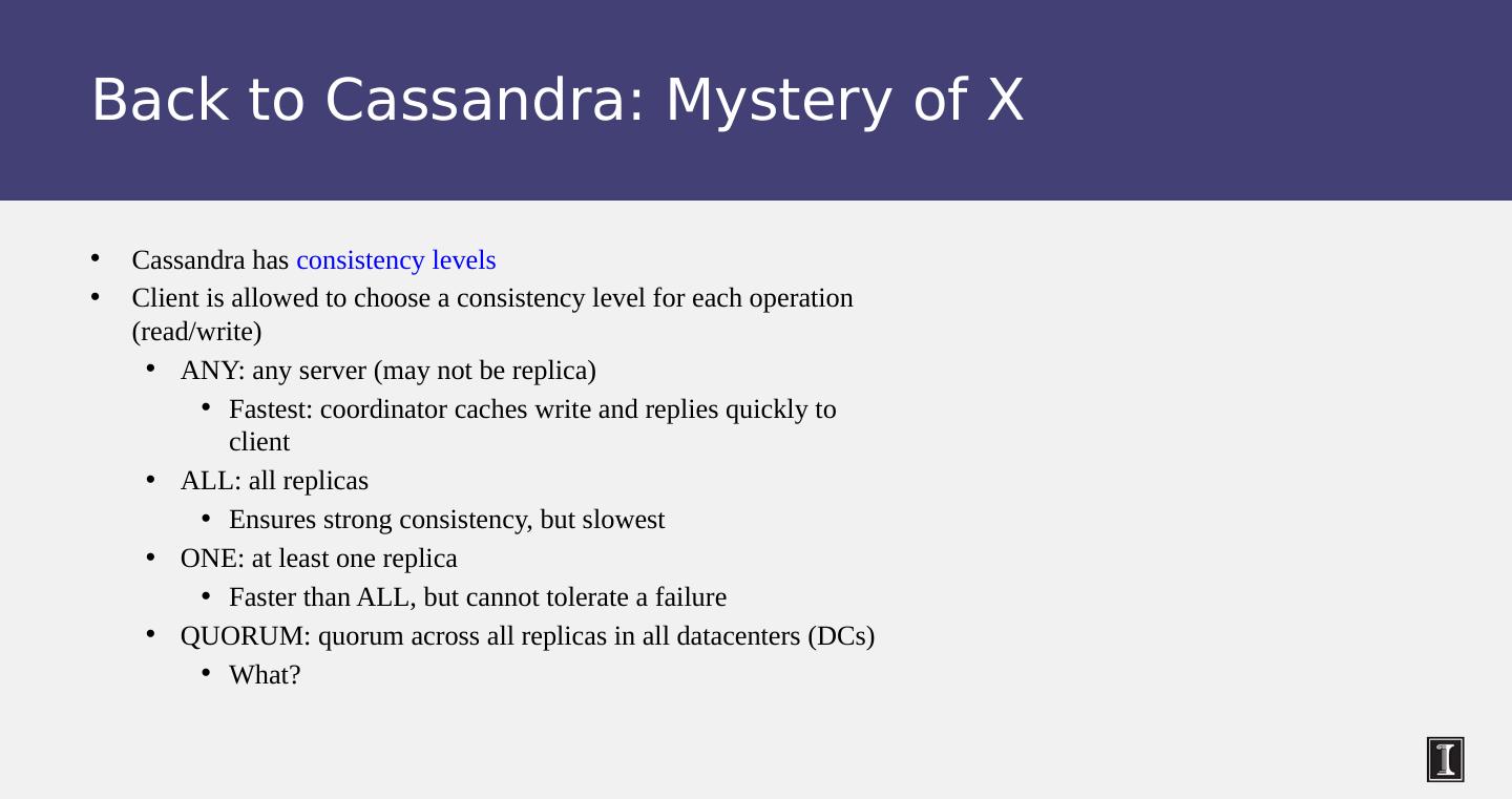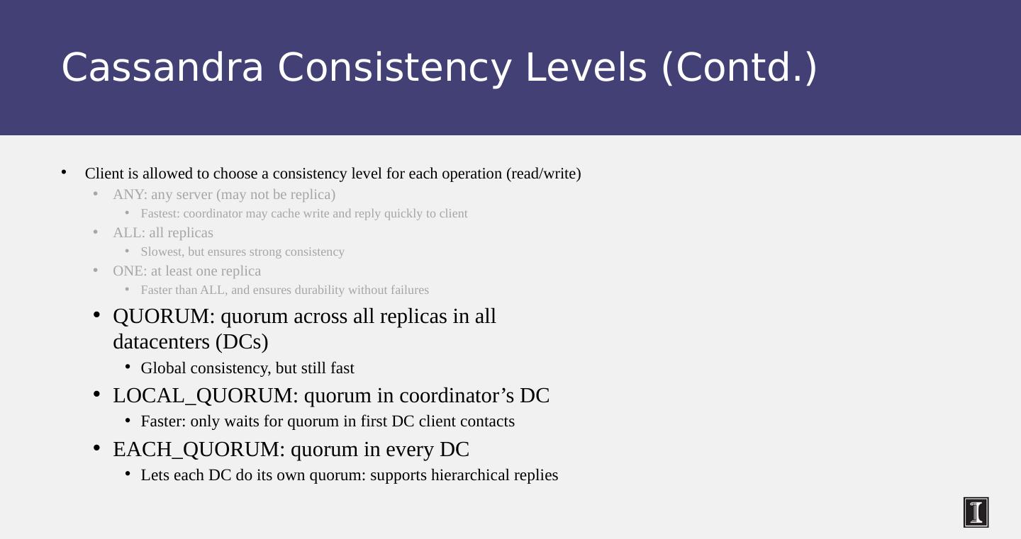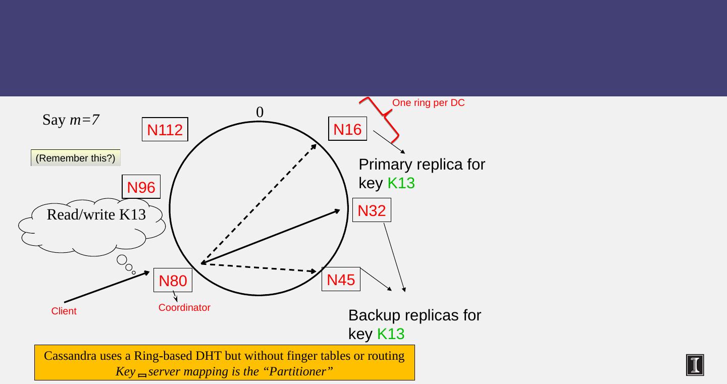 15 .N80 0 Say m=7 N32 N45 Backup replicas for key K13 Cassandra uses a Ring-based DHT but without finger tables or routing Key server mapping is the “ Partitioner ” N112 N96 N16 Read/write K13 Primary replica for key K13 (Remember this?) Coordinator Client One ring per DC