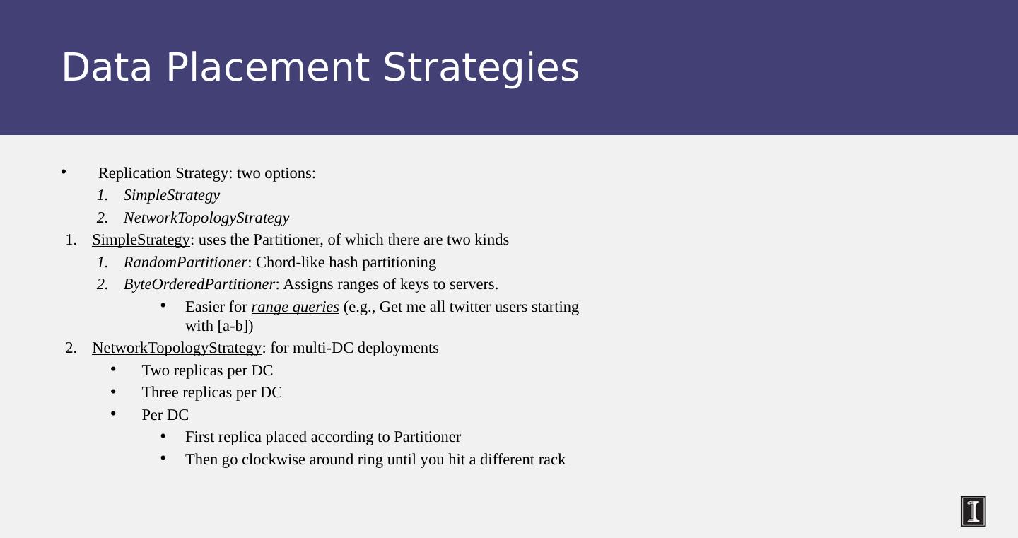 16 .Data Placement Strategies Replication Strategy: two options: SimpleStrategy NetworkTopologyStrategy SimpleStrategy : uses the Partitioner , of which there are two kinds RandomPartitioner : Chord-like hash partitioning ByteOrderedPartitioner : Assigns ranges of keys to servers. Easier for range queries (e.g., Get me all twitter users starting with [a-b]) NetworkTopologyStrategy : for multi-DC deployments Two replicas per DC Three replicas per DC Per DC First replica placed according to Partitioner Then go clockwise around ring until you hit a different rack