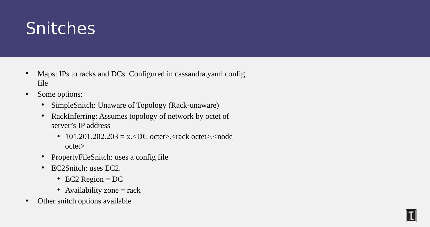 17 .Snitches Maps: IPs to racks and DCs. Configured in cassandra.yaml config file Some options: SimpleSnitch : Unaware of Topology (Rack-unaware) RackInferring : Assumes topology of network by octet of server’s IP address 101.201.202.203 = x.<DC octet>.<rack octet>.<node octet> PropertyFileSnitch : uses a config file EC2Snitch: uses EC2. EC2 Region = DC Availability zone = rack Other snitch options available