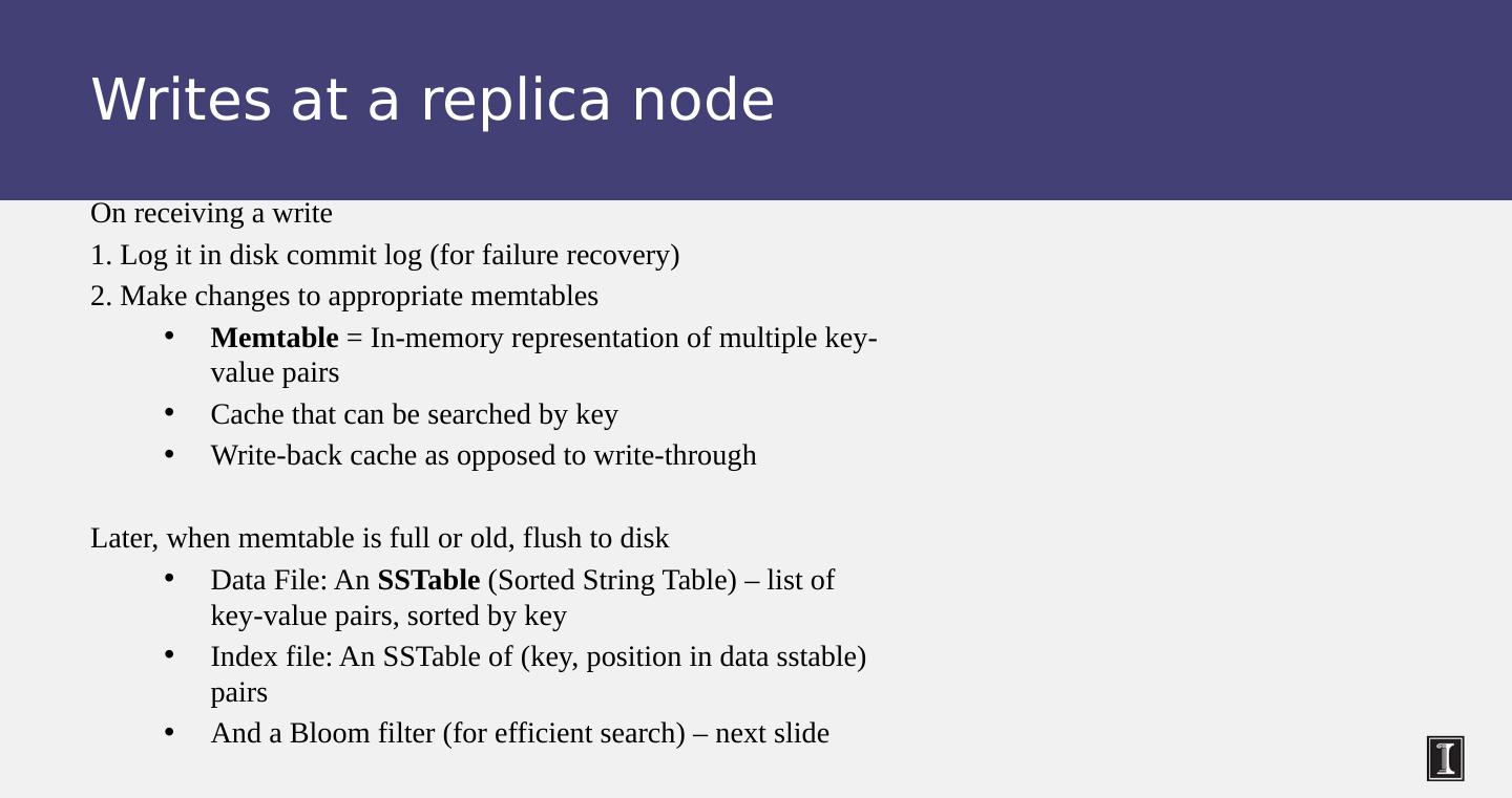 20 .Writes at a replica node On receiving a write 1. Log it in disk commit log (for failure recovery) 2. Make changes to appropriate memtables Memtable = In-memory representation of multiple key-value pairs Cache that can be searched by key Write-back cache as opposed to write-through Later, when memtable is full or old, flush to disk Data File: An SSTable (Sorted String Table) – list of key-value pairs, sorted by key Index file: An SSTable of (key, position in data sstable ) pairs And a Bloom filter (for efficient search) – next slide