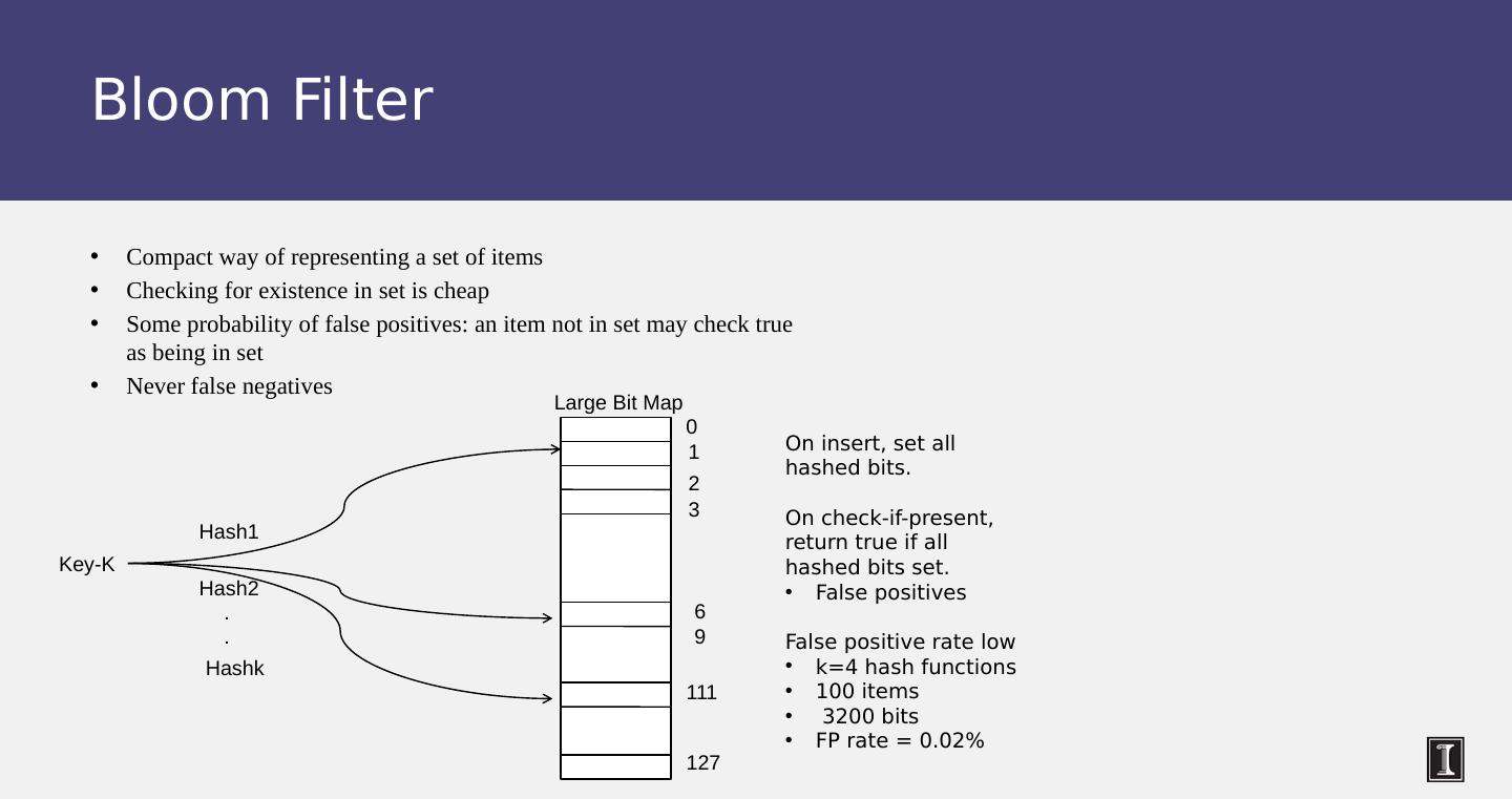21 .Bloom Filter Compact way of representing a set of items Checking for existence in set is cheap Some probability of false positives: an item not in set may check true as being in set Never false negatives Large Bit Map 0 1 2 3 69 127 111 Key-K Hash1 Hash2 Hashk On insert, set all hashed bits. On check-if-present, return true if all hashed bits set. False positives False positive rate low k=4 hash functions 100 items 3200 bits FP rate = 0.02% . .