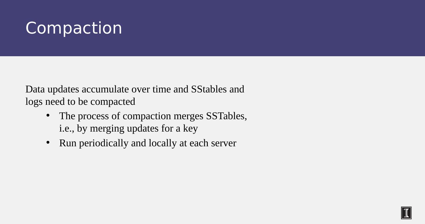 22 .Compaction Data updates accumulate over time and SStables and logs need to be compacted The process of compaction merges SSTables , i.e., by merging updates for a key Run periodically and locally at each server