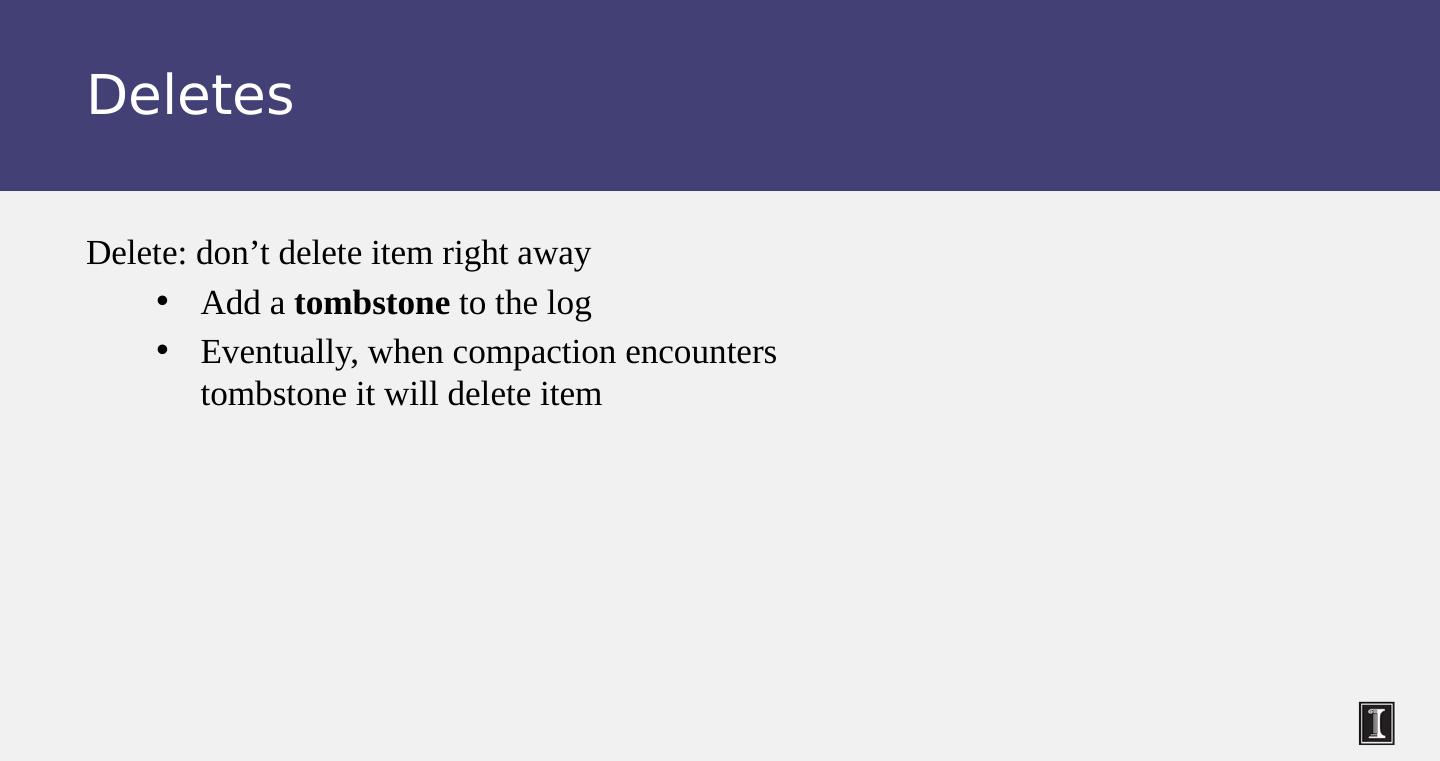 23 .Deletes Delete: don’t delete item right away Add a tombstone to the log Eventually, when compaction encounters tombstone it will delete item