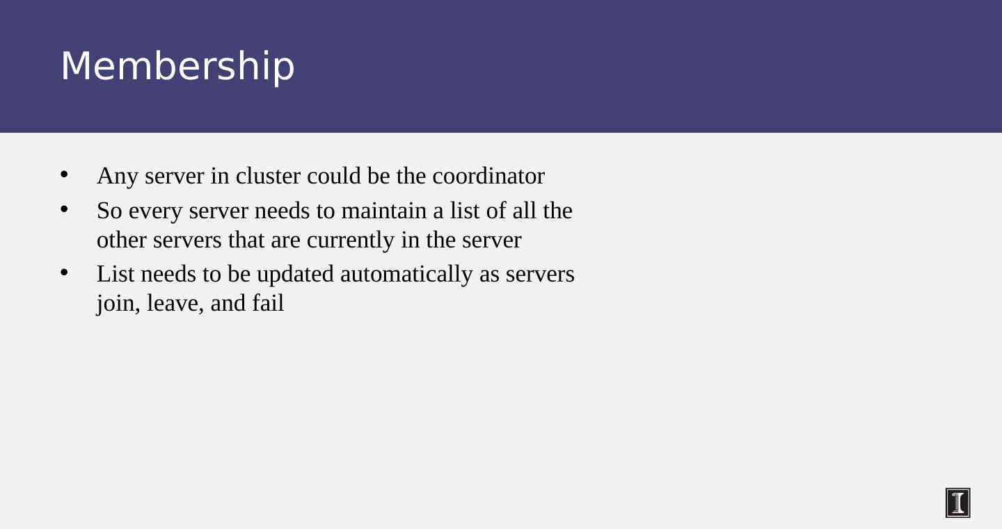 25 .Membership Any server in cluster could be the coordinator So every server needs to maintain a list of all the other servers that are currently in the server List needs to be updated automatically as servers join, leave, and fail