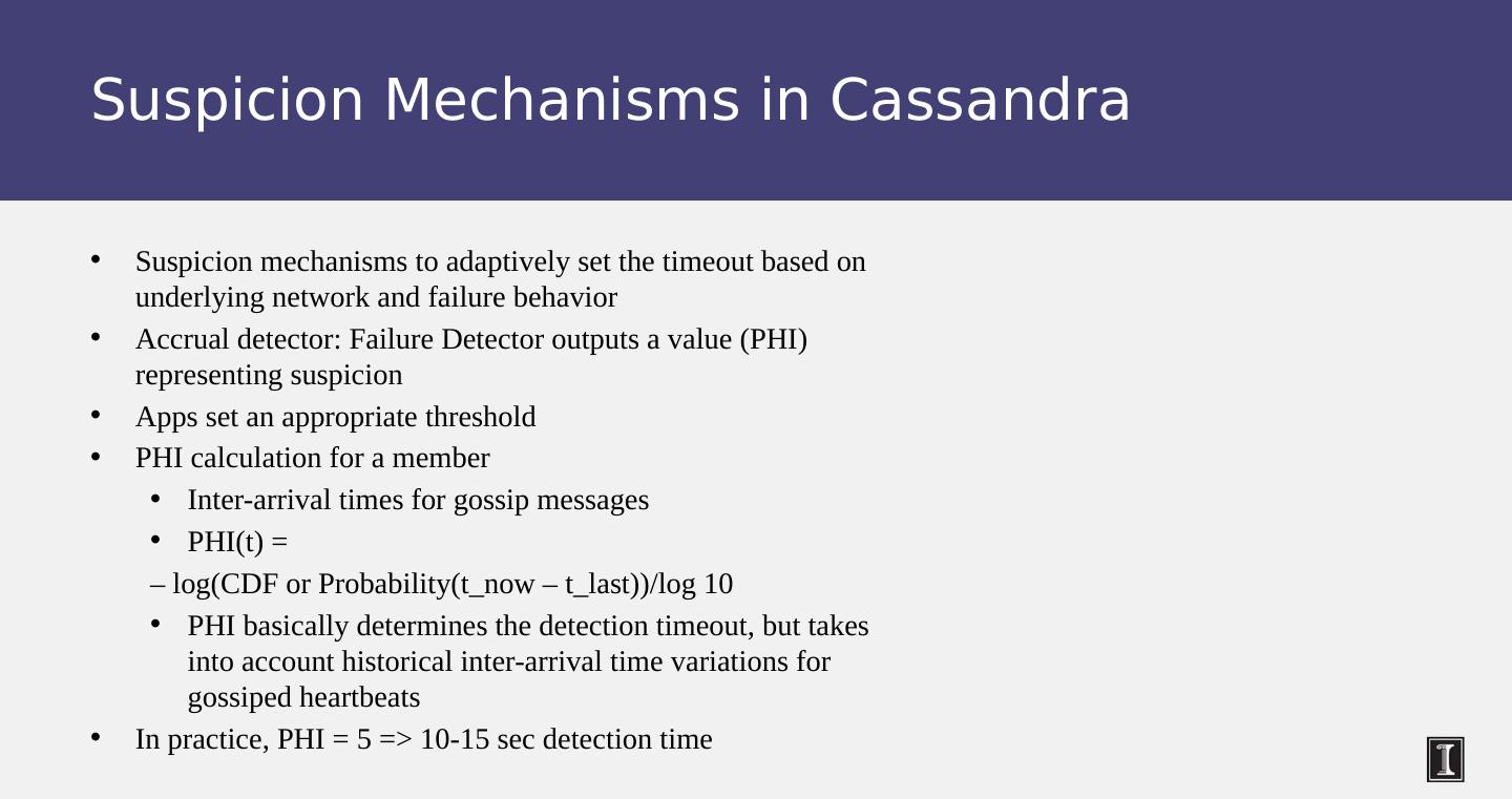 27 .Suspicion Mechanisms in Cassandra Suspicion mechanisms to adaptively set the timeout based on underlying network and failure behavior Accrual detector: Failure Detector outputs a value (PHI) representing suspicion Apps set an appropriate threshold PHI calculation for a member Inter-arrival times for gossip messages PHI(t) = – log(CDF or Probability( t_now – t_last ))/log 10 PHI basically determines the detection timeout, but takes into account historical inter-arrival time variations for gossiped heartbeats In practice, PHI = 5 => 10-15 sec detection time