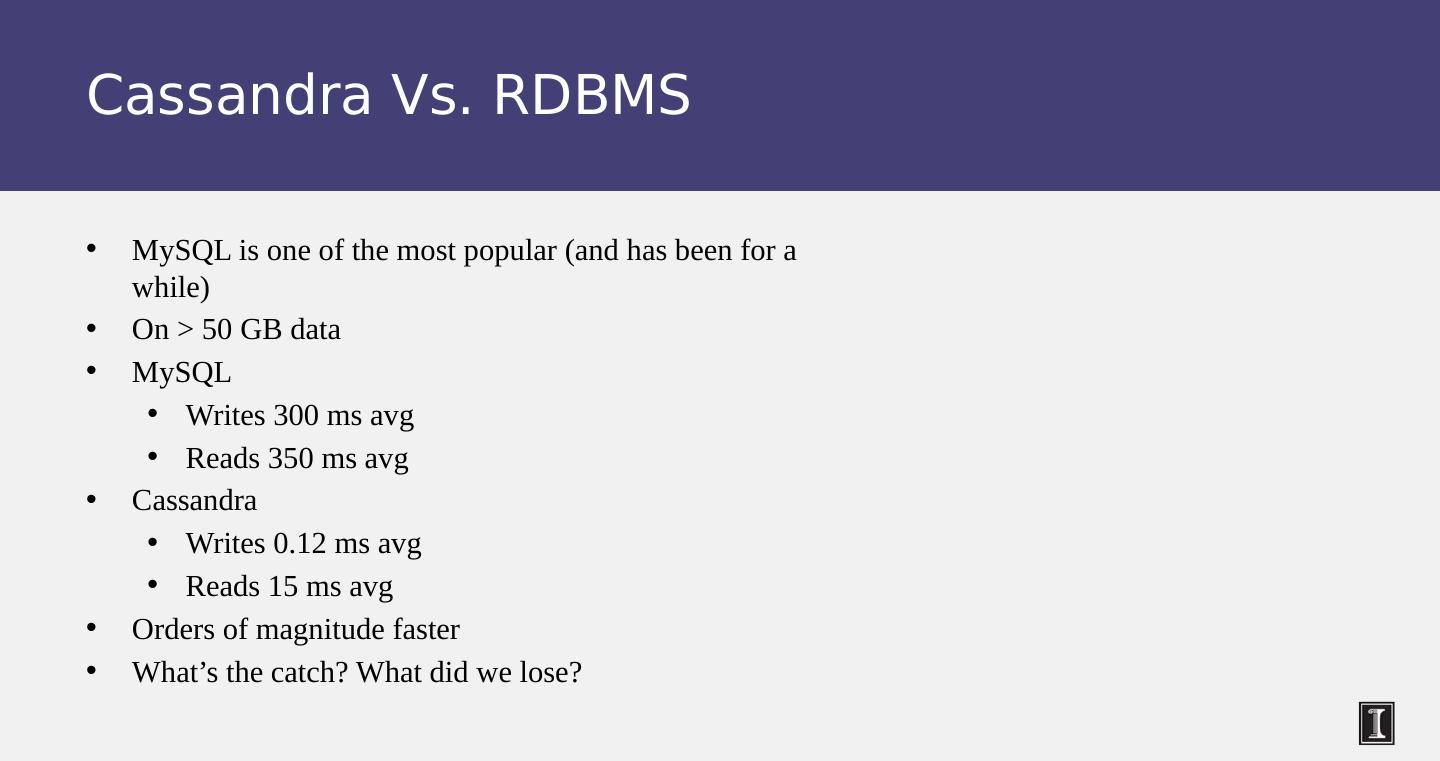 28 .Cassandra Vs. RDBMS MySQL is one of the most popular (and has been for a while) On > 50 GB data MySQL Writes 300 ms avg Reads 350 ms avg Cassandra Writes 0.12 ms avg Reads 15 ms avg Orders of magnitude faster What ’ s the catch? What did we lose?