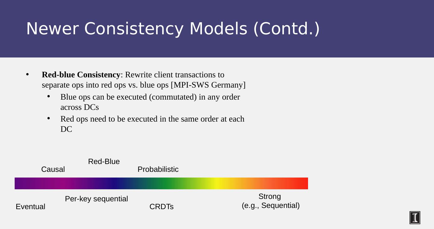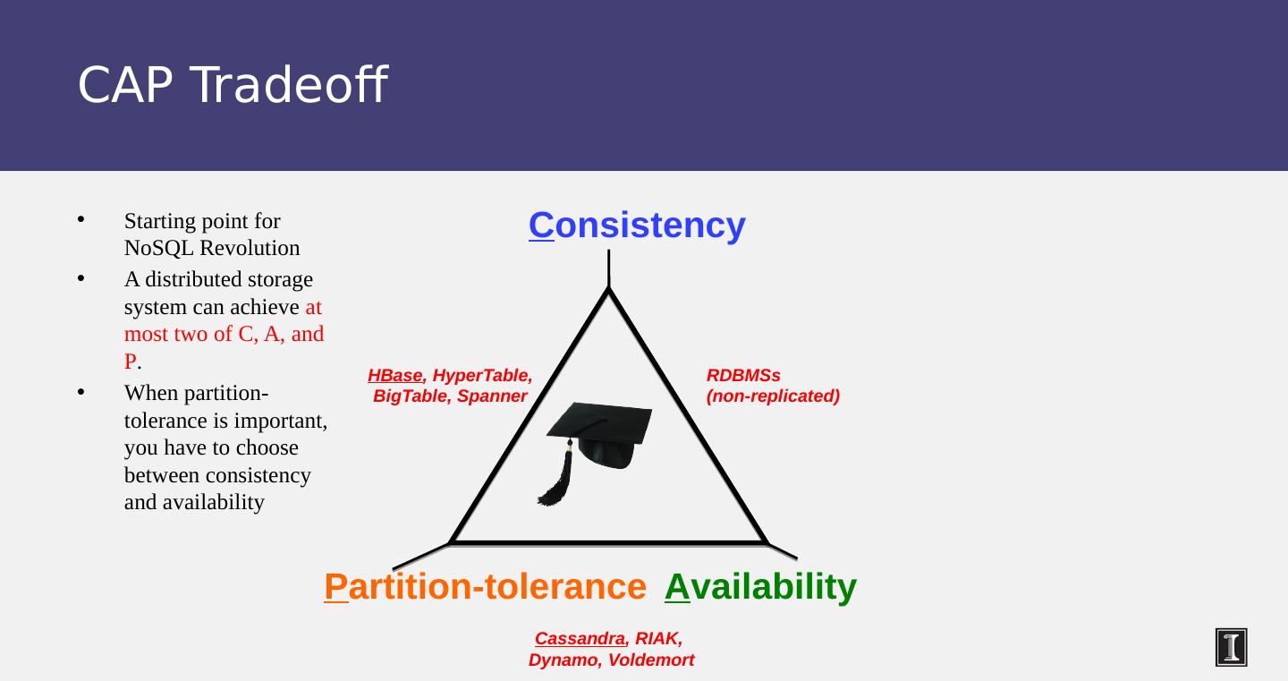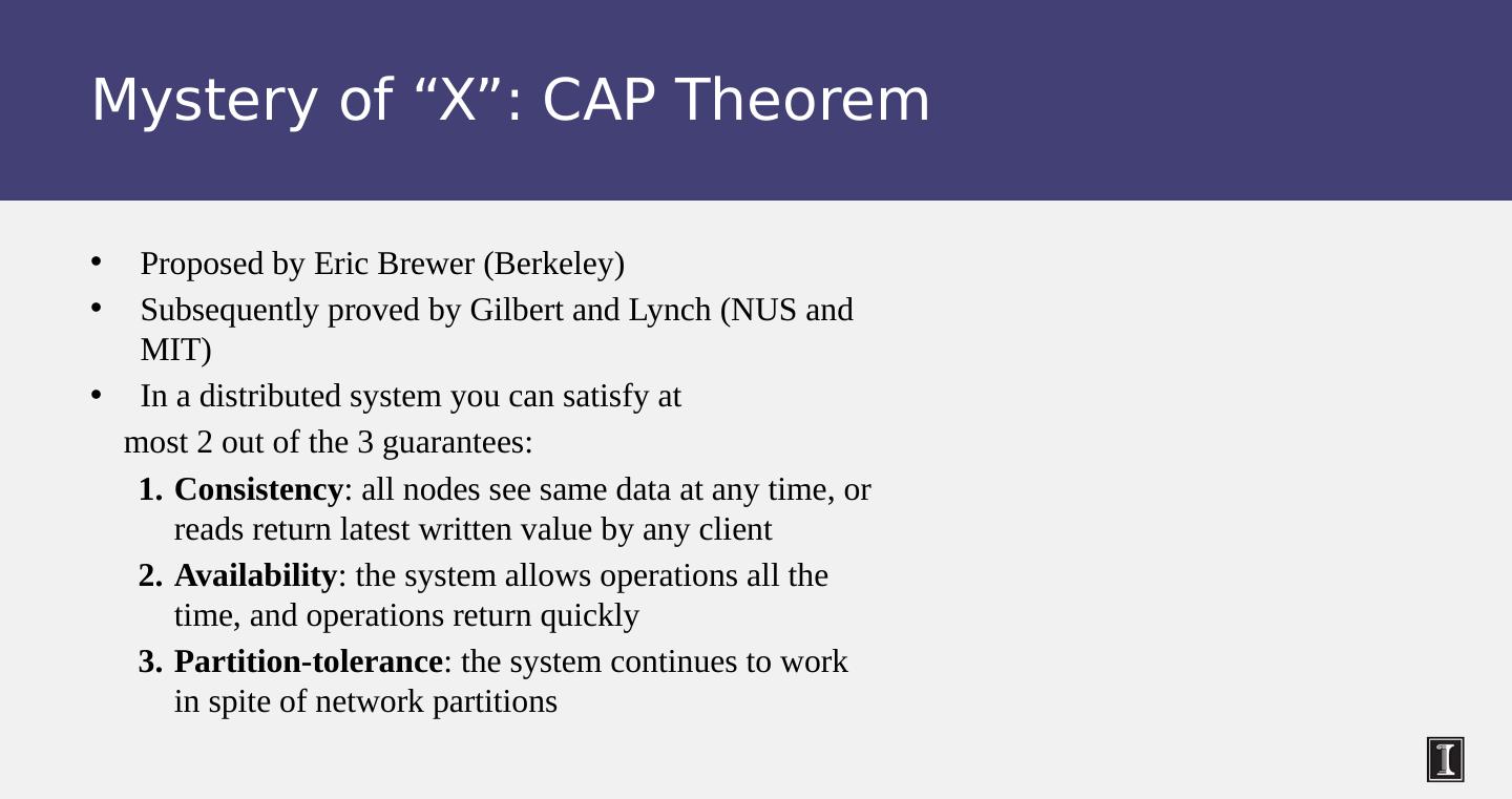 29 .Mystery of “X”: CAP Theorem Proposed by Eric Brewer (Berkeley) Subsequently proved by Gilbert and Lynch (NUS and MIT) In a distributed system you can satisfy at most 2 out of the 3 guarantees: Consistency : all nodes see same data at any time, or reads return latest written value by any client Availability : the system allows operations all the time, and operations return quickly Partition-tolerance : the system continues to work in spite of network partitions