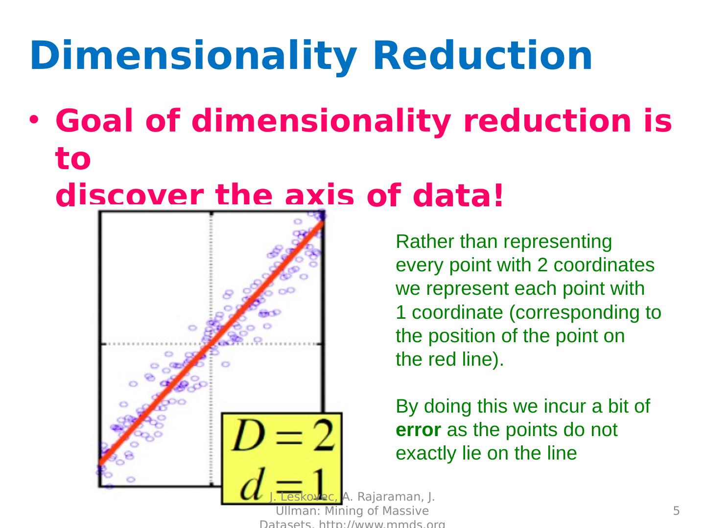 5 .Dimensionality Reduction Goal of dimensionality reduction is to discover the axis of data! Rather than representing every point with 2 coordinates we represent each point with 1 coordinate (corresponding to the position of the point on the red line). By doing this we incur a bit of error as the points do not exactly lie on the line J. Leskovec, A. Rajaraman, J. Ullman: Mining of Massive Datasets, http://www.mmds.org 5