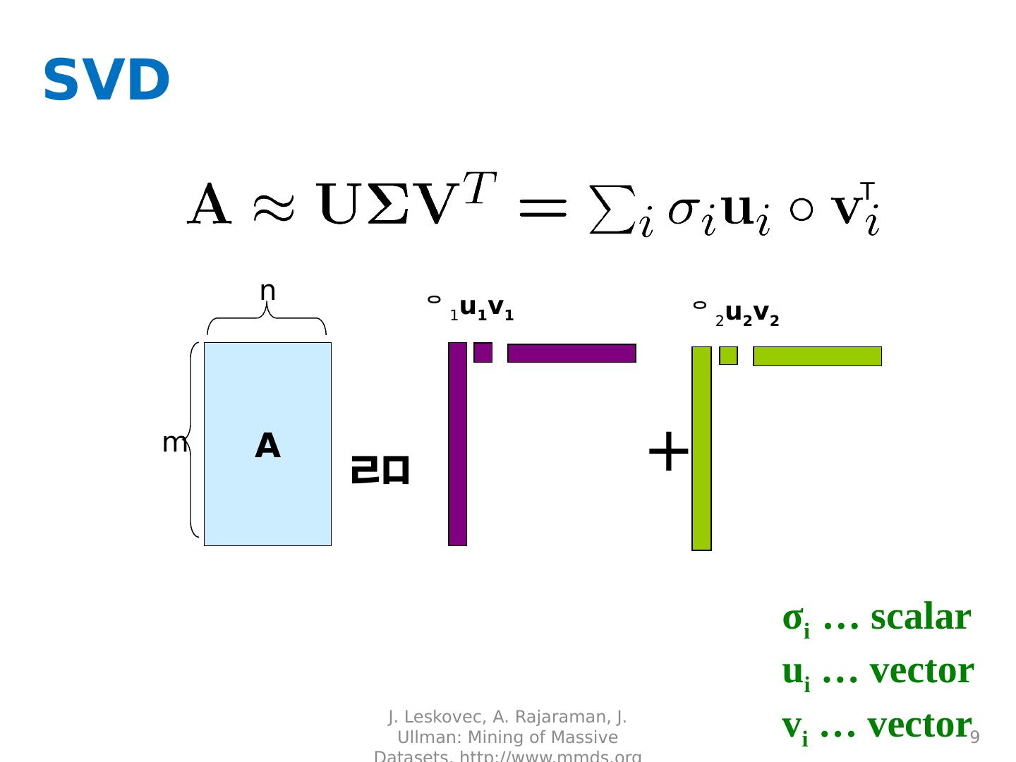 8 .SVD 8 A m n m n U V T J. Leskovec, A. Rajaraman, J. Ullman: Mining of Massive Datasets, http://www.mmds.org T