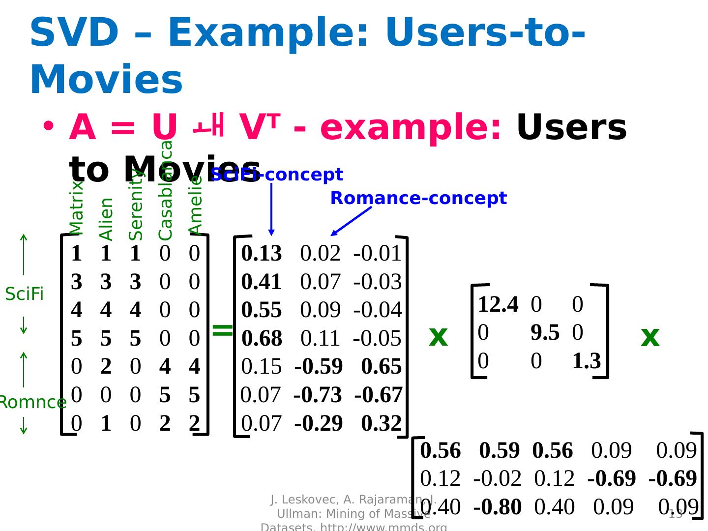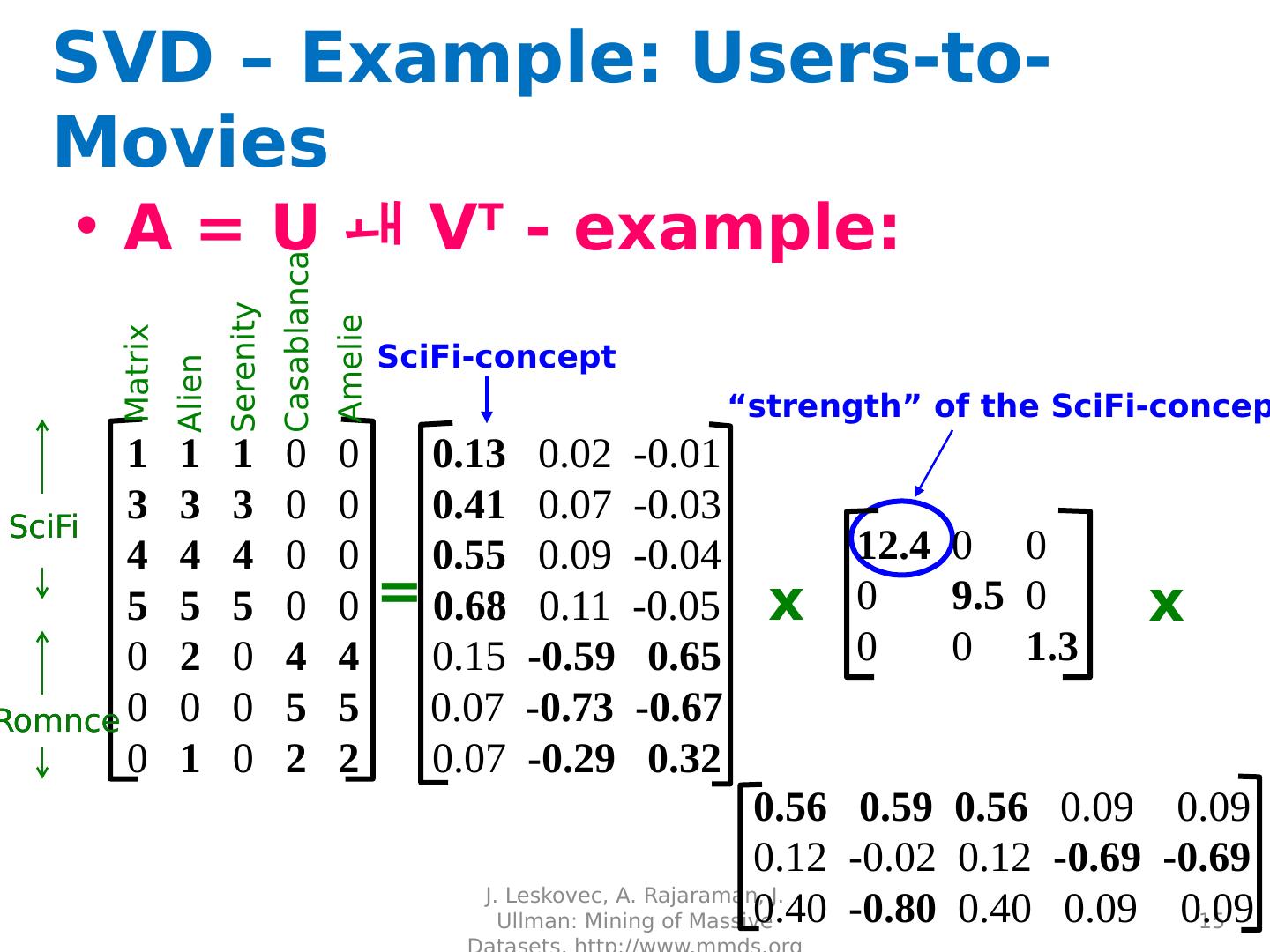 12 .SVD – Example: Users-to-Movies A = U V T - example: Users to Movies J. Leskovec, A. Rajaraman, J. Ullman: Mining of Massive Datasets, http://www.mmds.org 12 = SciFi Romnce x x Matrix Alien Serenity Casablanca Amelie 1 1 1 0 0 3 3 3 0 0 4 4 4 0 0 5 5 5 0 0 0 2 0 4 4 0 0 0 5 5 0 1 0 2 2 0.13 0.02 -0.01 0.41 0.07 -0.03 0.55 0.09 -0.04 0.68 0.11 -0.05 0.15 -0.59 0.65 0.07 -0.73 -0.67 0.07 -0.29 0.32 12.4 0 0 0 9.5 0 0 0 1.3 0.56 0.59 0.56 0.09 0.09 0.12 -0.02 0.12 -0.69 - 0.69 0.40 -0.80 0.40 0.09 0.09