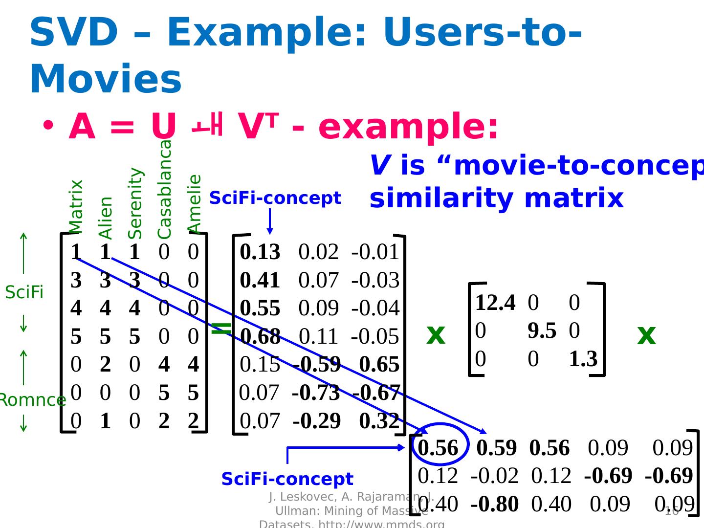 17 .J. Leskovec, A. Rajaraman, J. Ullman: Mining of Massive Datasets, http://www.mmds.org 17 SVD - Interpretation #1 ‘ movies ’, ‘ users ’ and ‘ concepts ’: U : user-to-concept similarity matrix V : movie-to-concept similarity matrix : its diagonal elements: ‘ strength’ of each concept