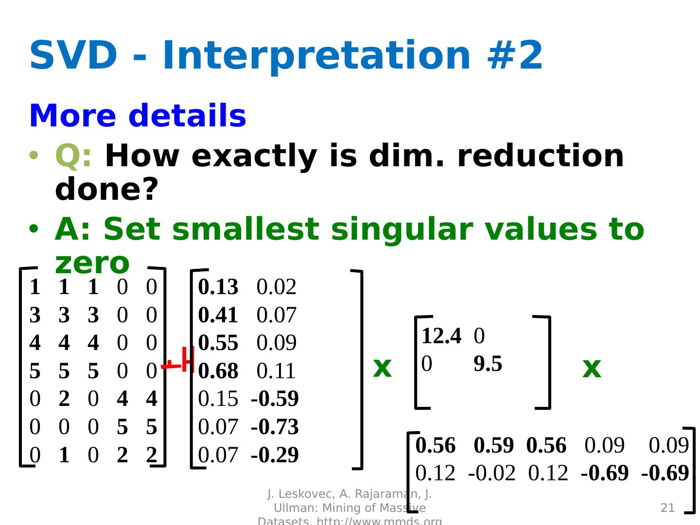 20 .SVD - Interpretation #2 More details Q: How exactly is dim. reduction done? A: Set smallest singular values to zero J. Leskovec, A. Rajaraman, J. Ullman: Mining of Massive Datasets, http://www.mmds.org 20 x x 1 1 1 0 0 3 3 3 0 0 4 4 4 0 0 5 5 5 0 0 0 2 0 4 4 0 0 0 5 5 0 1 0 2 2 0.13 0.02 -0.01 0.41 0.07 -0.03 0.55 0.09 -0.04 0.68 0.11 -0.05 0.15 -0.59 0.65 0.07 -0.73 -0.67 0.07 -0.29 0.32 12.4 0 0 0 9.5 0 0 0 1.3 0.56 0.59 0.56 0.09 0.09 0.12 -0.02 0.12 -0.69 - 0.69 0.40 -0.80 0.40 0.09 0.09