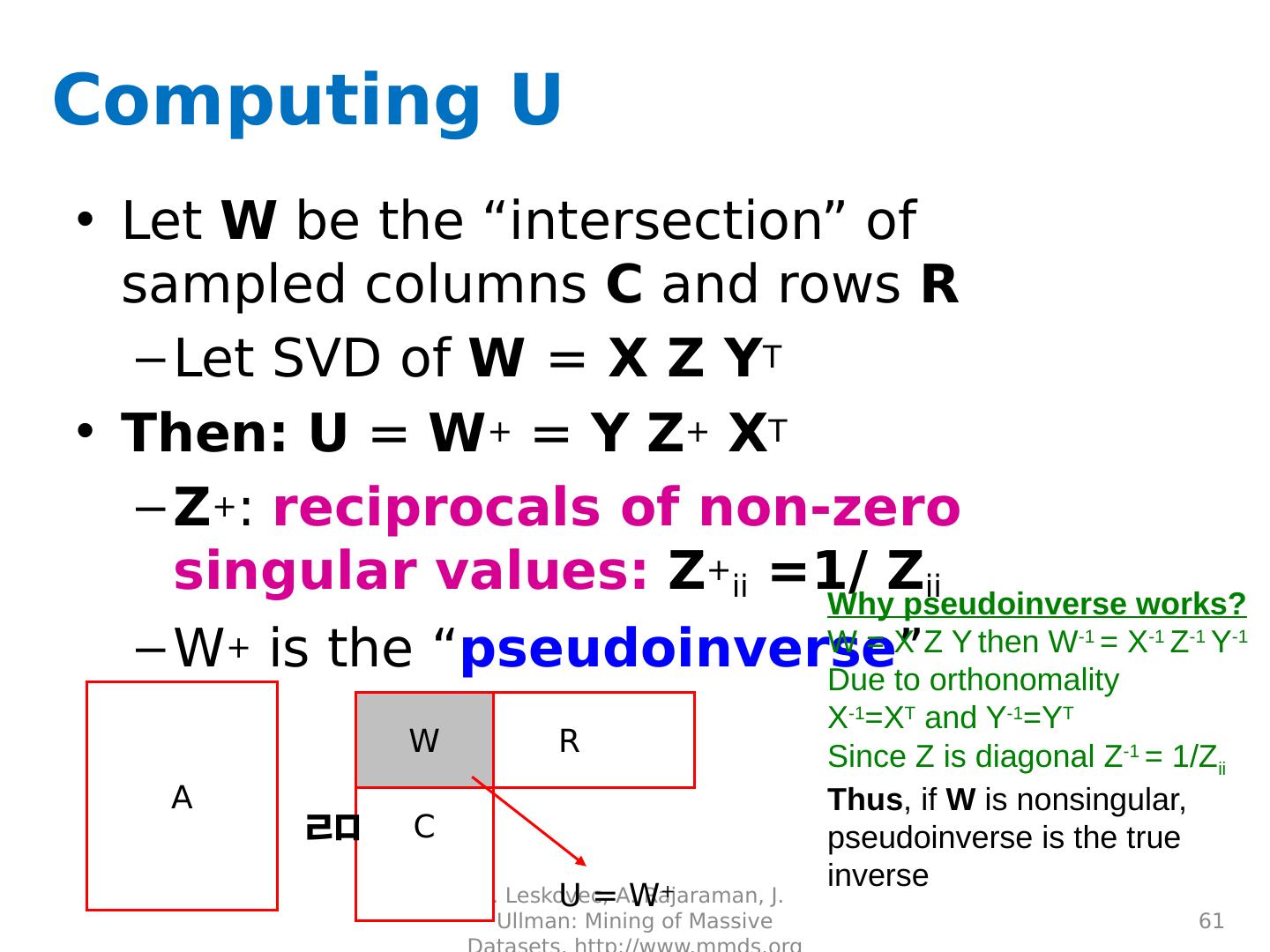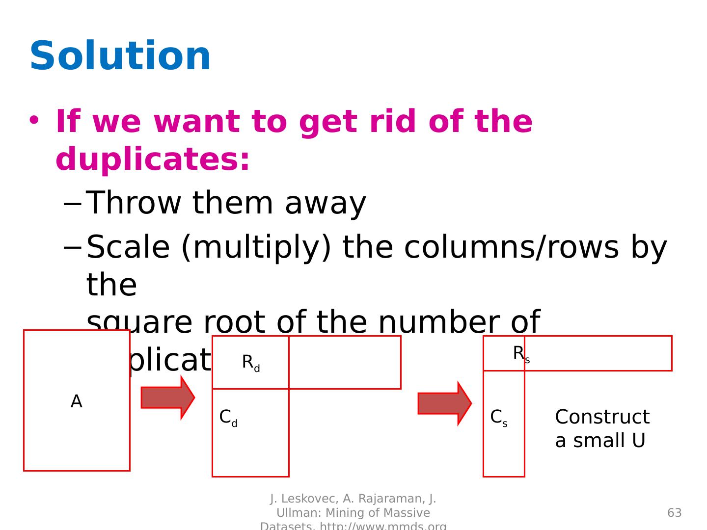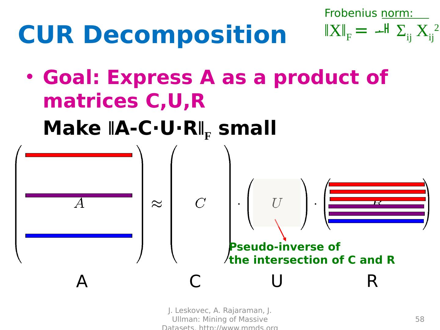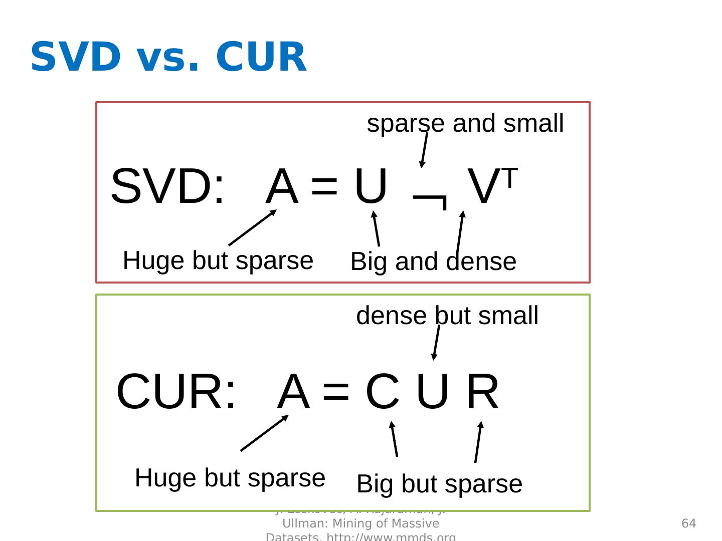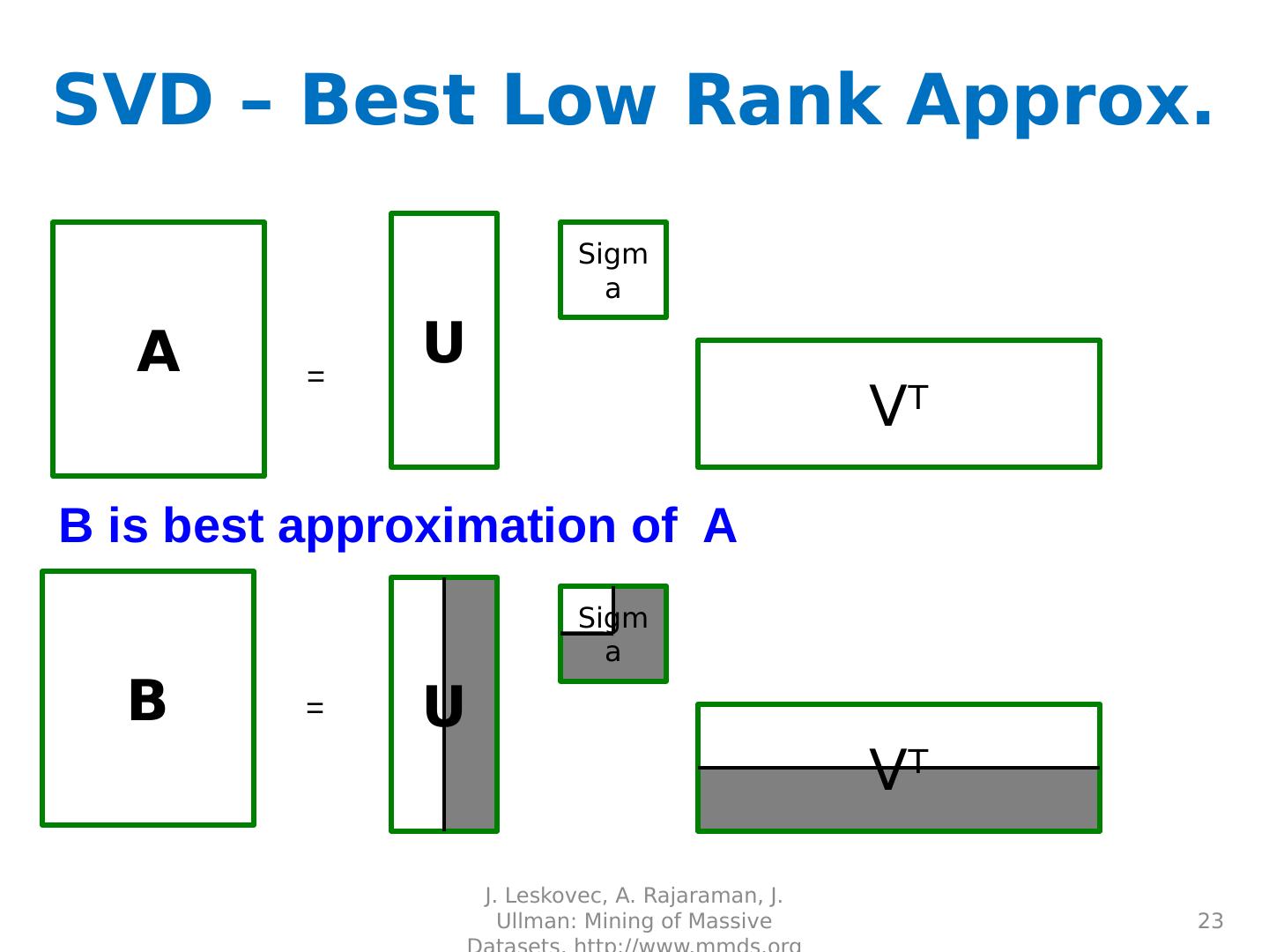 23 .SVD – Best Low Rank Approx. J. Leskovec, A. Rajaraman, J. Ullman: Mining of Massive Datasets, http://www.mmds.org 23 A U Sigma V T = B U Sigma V T = B is best approximation of A