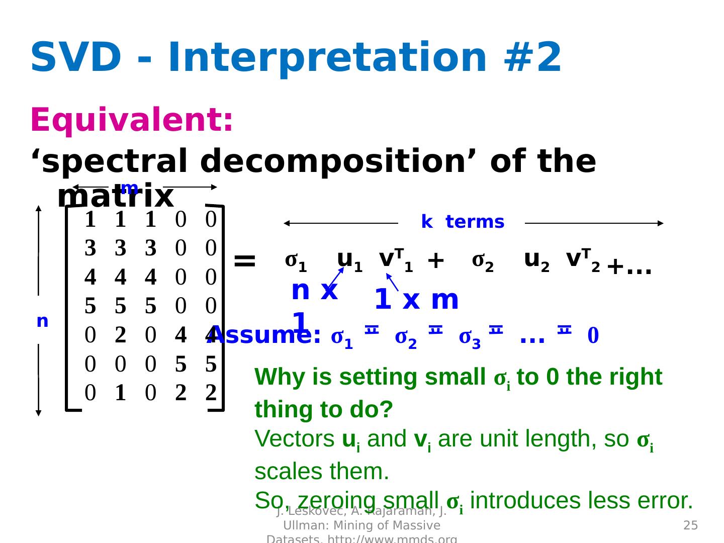 25 .SVD - Interpretation #2 Equivalent : ‘spectral decomposition’ of the matrix J. Leskovec, A. Rajaraman, J. Ullman: Mining of Massive Datasets, http://www.mmds.org 25 = u 1 σ 1 v T 1 u 2 σ 2 v T 2 + +... n m n x 1 1 x m k terms Assume : σ 1 σ 2 σ 3 ... 0 Why is setting small σ i to 0 the right thing to do? Vectors u i and v i are unit length, so σ i scales them. So, zeroing small σ i introduces less error. 1 1 1 0 0 3 3 3 0 0 4 4 4 0 0 5 5 5 0 0 0 2 0 4 4 0 0 0 5 5 0 1 0 2 2