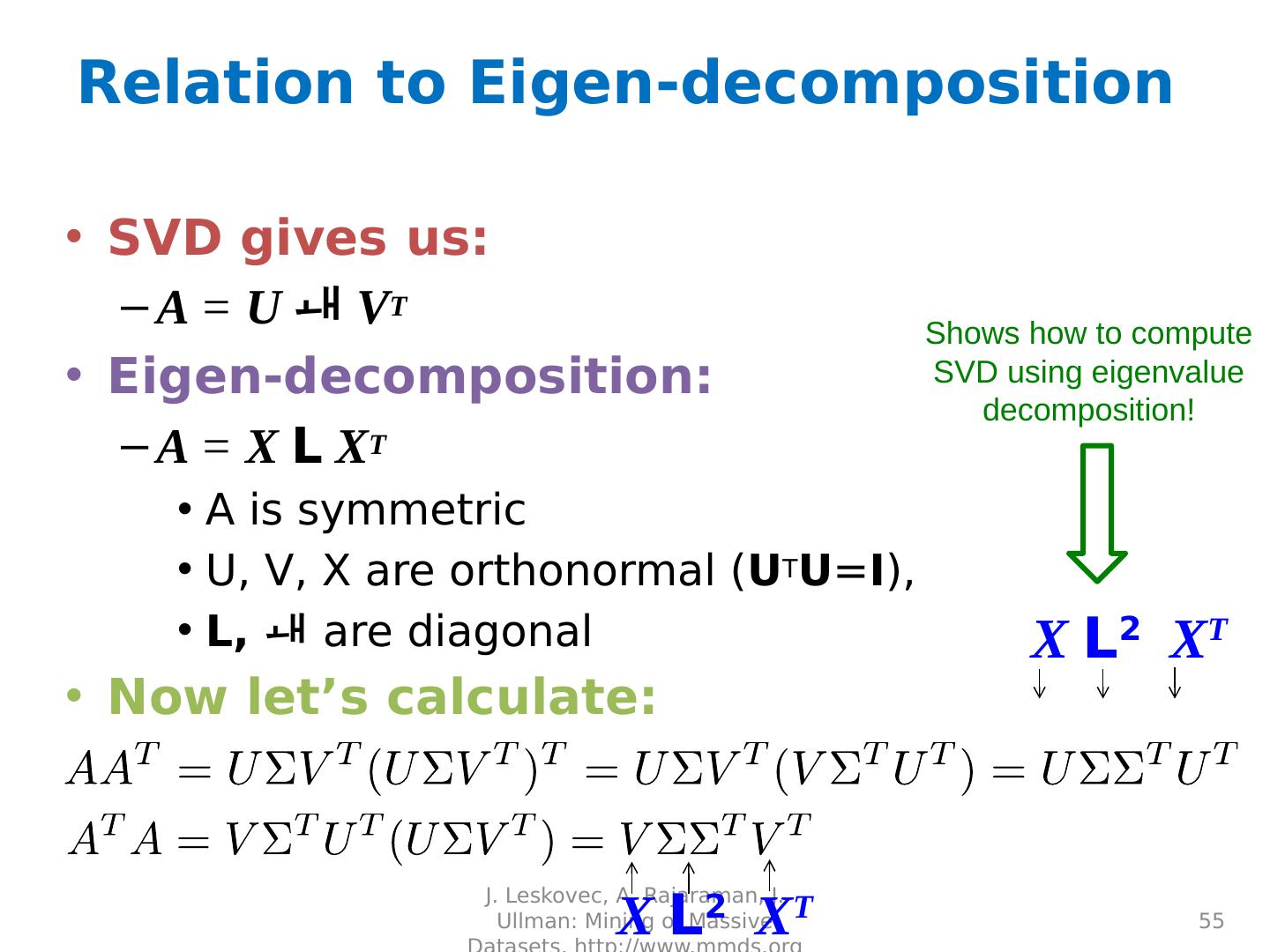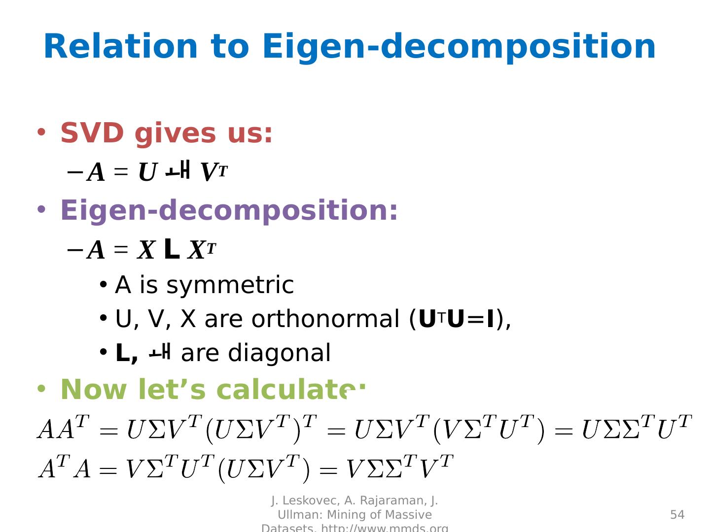 10 .SVD - Properties It is always possible to decompose a real matrix A into A = U V T , where U, , V : unique U , V : column orthonormal U T U = I ; V T V = I ( I : identity matrix) (Columns are orthogonal unit vectors) : diagonal Entries ( singular values ) are positive , and sorted in decreasing order ( σ 1 σ 2 ... 0 ) J. Leskovec, A. Rajaraman, J. Ullman: Mining of Massive Datasets, http://www.mmds.org 10 Nice proof of uniqueness: http ://www.mpi-inf.mpg.de/~bast/ir-seminar-ws04/lecture2.pdf