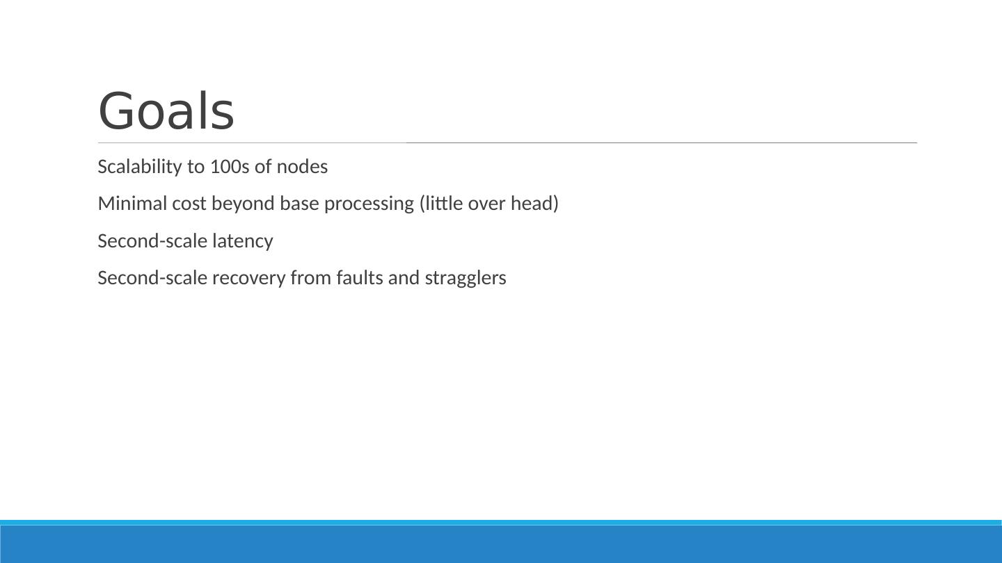 3 .Goals Scalability to 100s of nodes Minimal cost beyond base processing (little over head) Second-scale latency Second-scale recovery from faults and stragglers