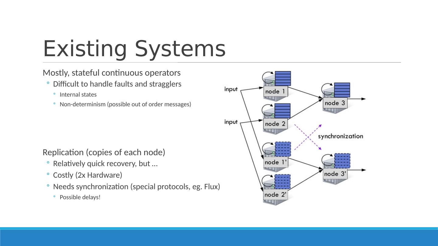 4 .Existing Systems Mostly, stateful continuous operators Difficult to handle faults and stragglers Internal states Non-determinism (possible out of order messages) Replication (copies of each node) Relatively quick recovery, but … Costly (2x Hardware) Needs synchronization (special protocols, eg . Flux) Possible delays!