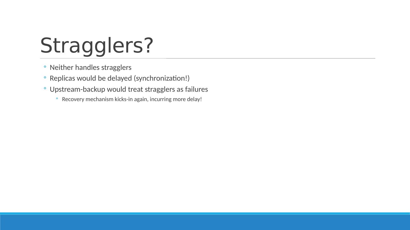 6 .Stragglers? Neither handles stragglers Replicas would be delayed (synchronization !) Upstream-backup would treat stragglers as failures Recovery mechanism kicks-in again, incurring more delay!