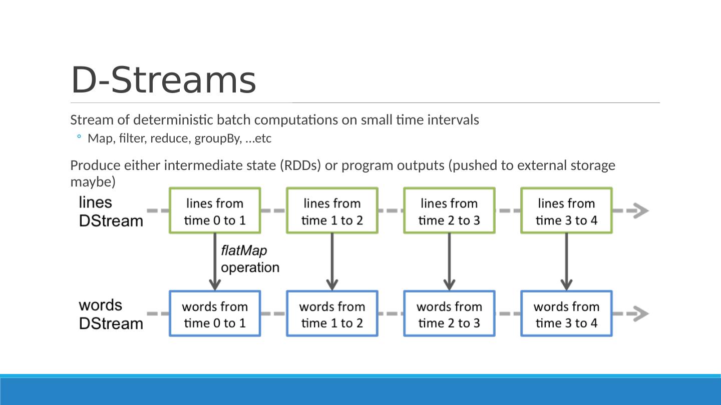 8 .D-Streams Stream of deterministic batch computations on small time intervals Map, filter, reduce, groupBy , … etc Produce either intermediate state (RDDs) or program outputs (pushed to external storage maybe)