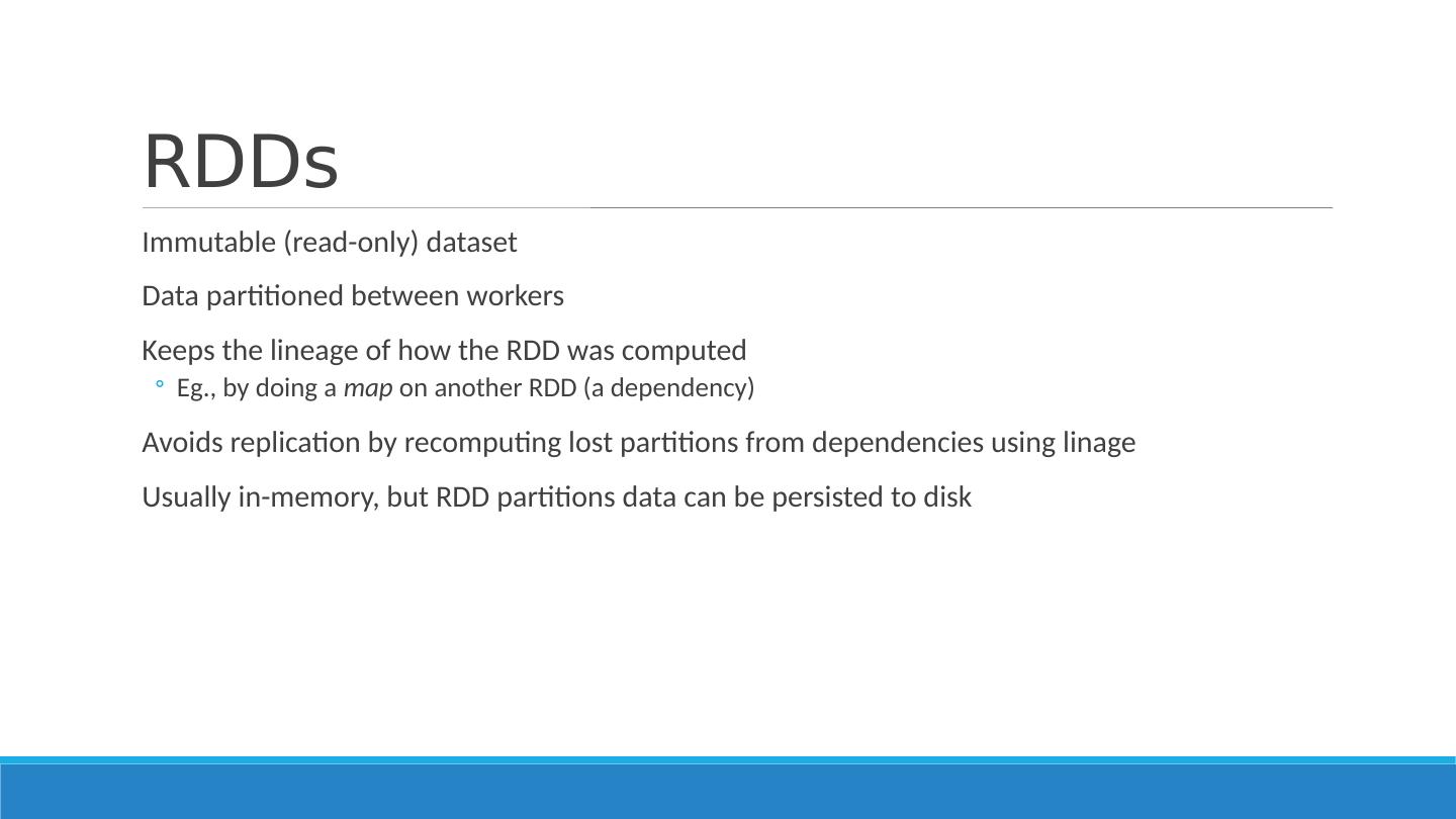 9 .RDDs Immutable (read-only) dataset Data partitioned between workers Keeps the lineage of how the RDD was computed Eg ., by doing a map on another RDD (a dependency) Avoids replication by recomputing lost partitions from dependencies using linage Usually in-memory, but RDD partitions data can be persisted to disk
