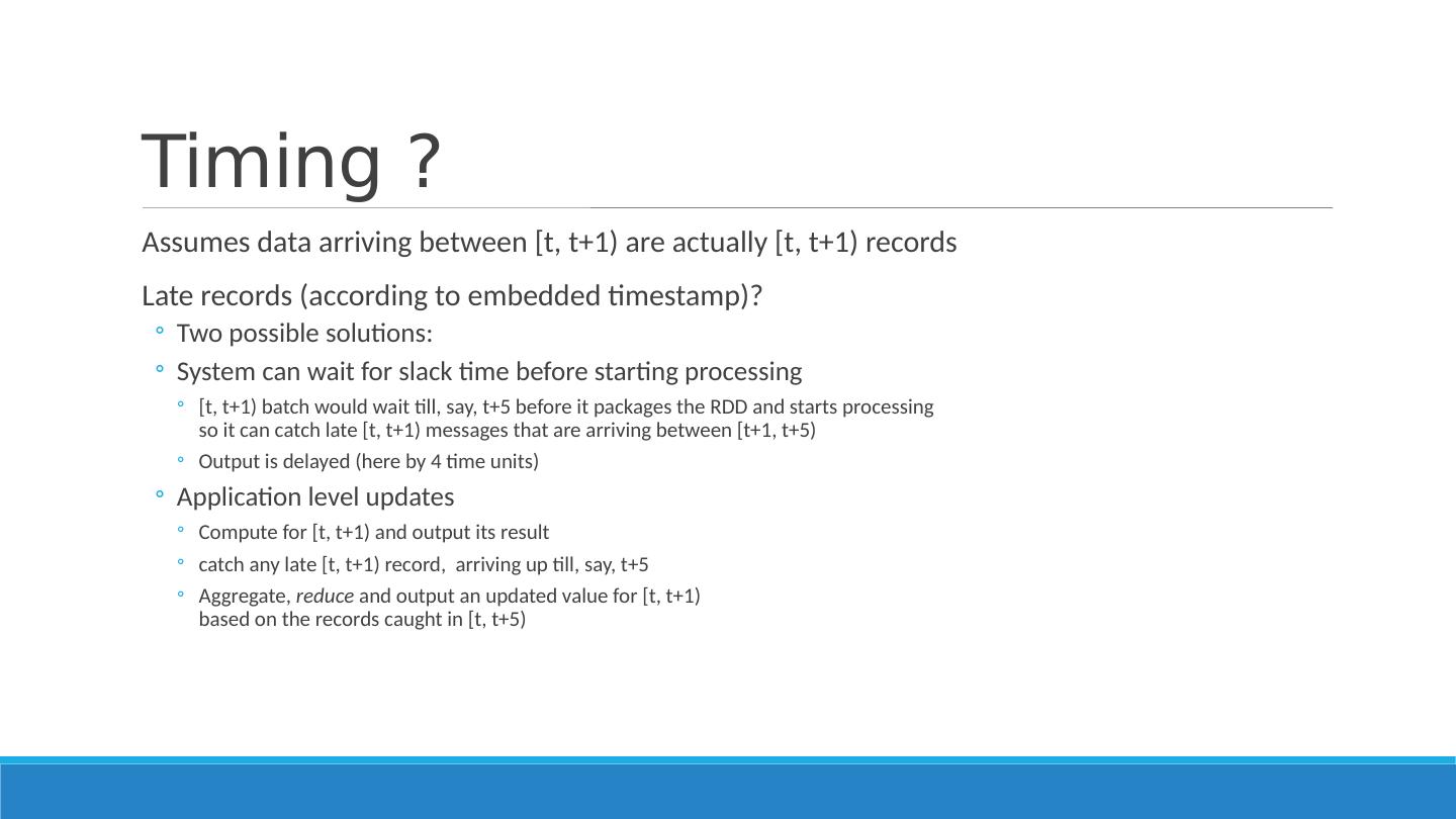12 .Timing ? Assumes data arriving between [t, t+1) are actually [t, t+1) records Late records (according to embedded timestamp)? Two possible solutions: System can wait for slack time before starting processing [t, t+1) batch would wait till, say, t+5 before it packages the RDD and starts processing so it can catch late [t, t+1) messages that are arriving between [t+1, t+5) Output is delayed (here by 4 time units) Application level updates Compute for [t, t+1) and output its result catch any late [t, t+1) record, arriving up till, say, t+5 Aggregate, reduce and output an updated value for [t, t+1) based on the records caught in [t, t+5)