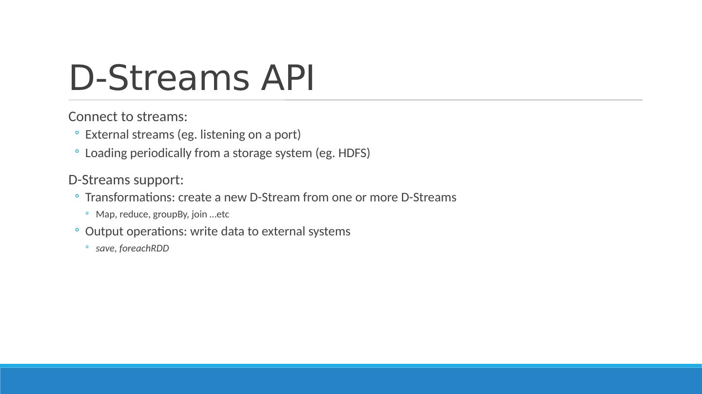 13 .D-Streams API Connect to streams: External streams ( eg . listening on a port) Loading periodically from a storage system ( eg . HDFS) D-Streams support: Transformations: create a new D-Stream from one or more D-Streams Map, reduce, groupBy , join … etc Output operations: write data to external systems save, foreachRDD
